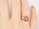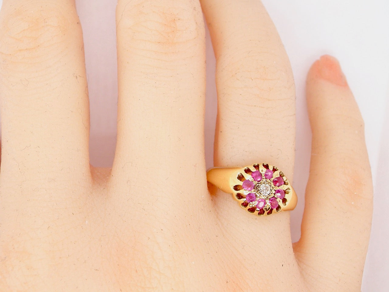 An 18 carat gold cluster ring containing an old brilliant cut diamond centre stone 1.8mm (0.025 carats) surrounded by eight small rubies 1.5mm each.