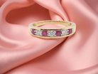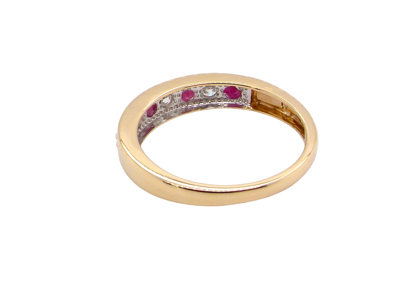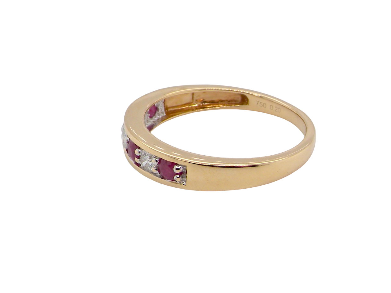 An 18 carat yellow gold half hoop eternity ring. Set with alternate rubies and diamonds. The four 2.4mm rubies have an estimated total carat weight = to .36.