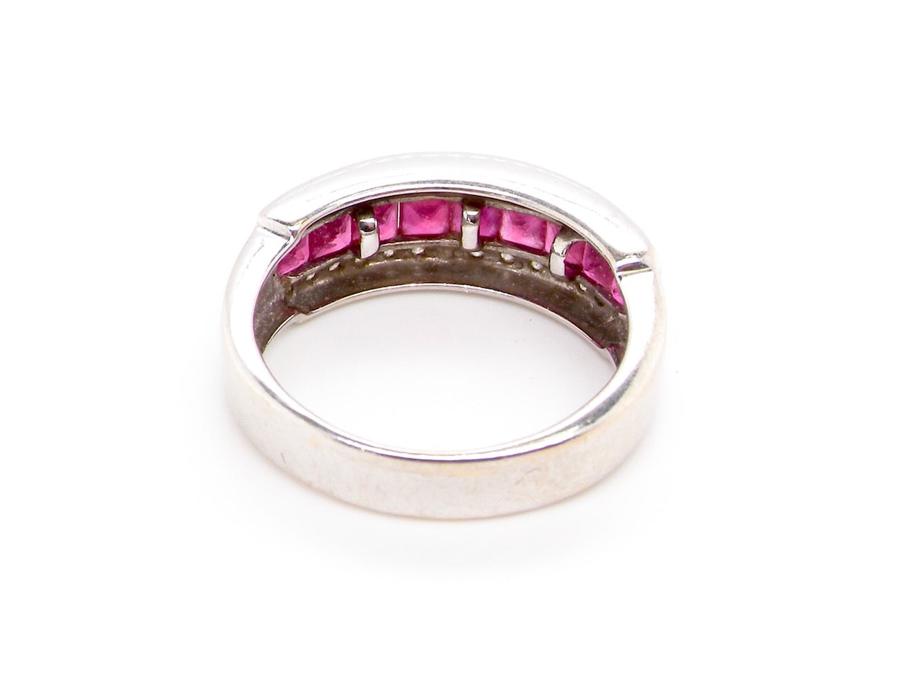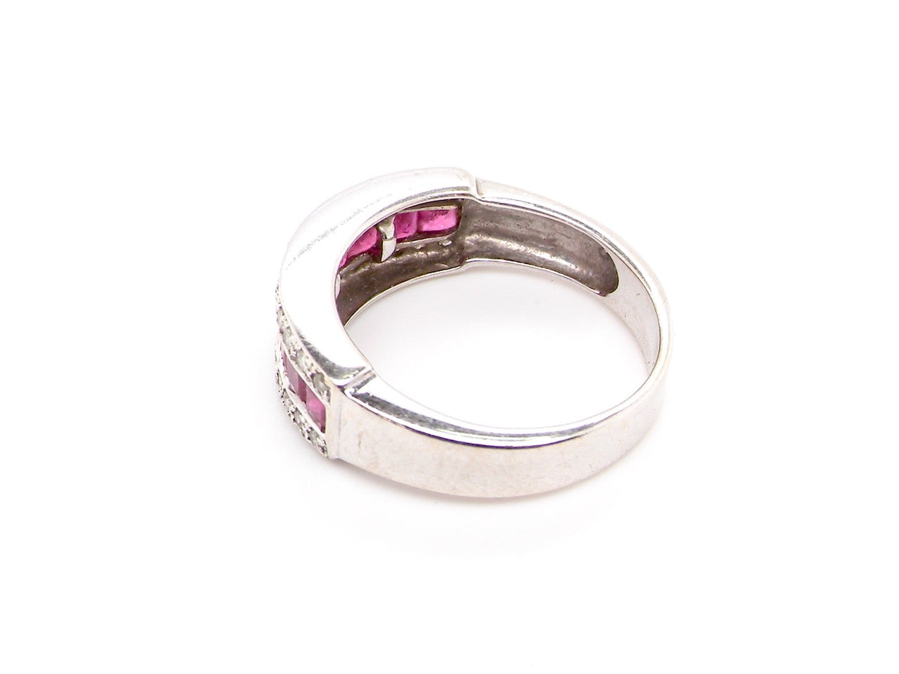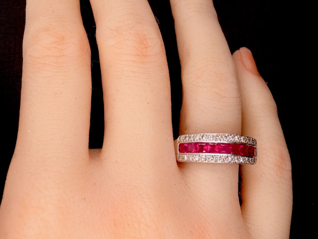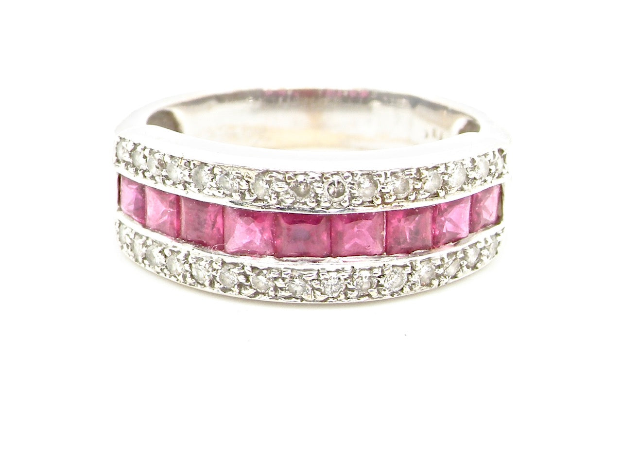 A half hoop ring testing as 18 carat white gold. The centre row of rubies number nine, each 3x3mm, close channel set. Above and below there are fifteen brilliant cut white diamonds, each 1.5mm, total 0.25 carats each line.