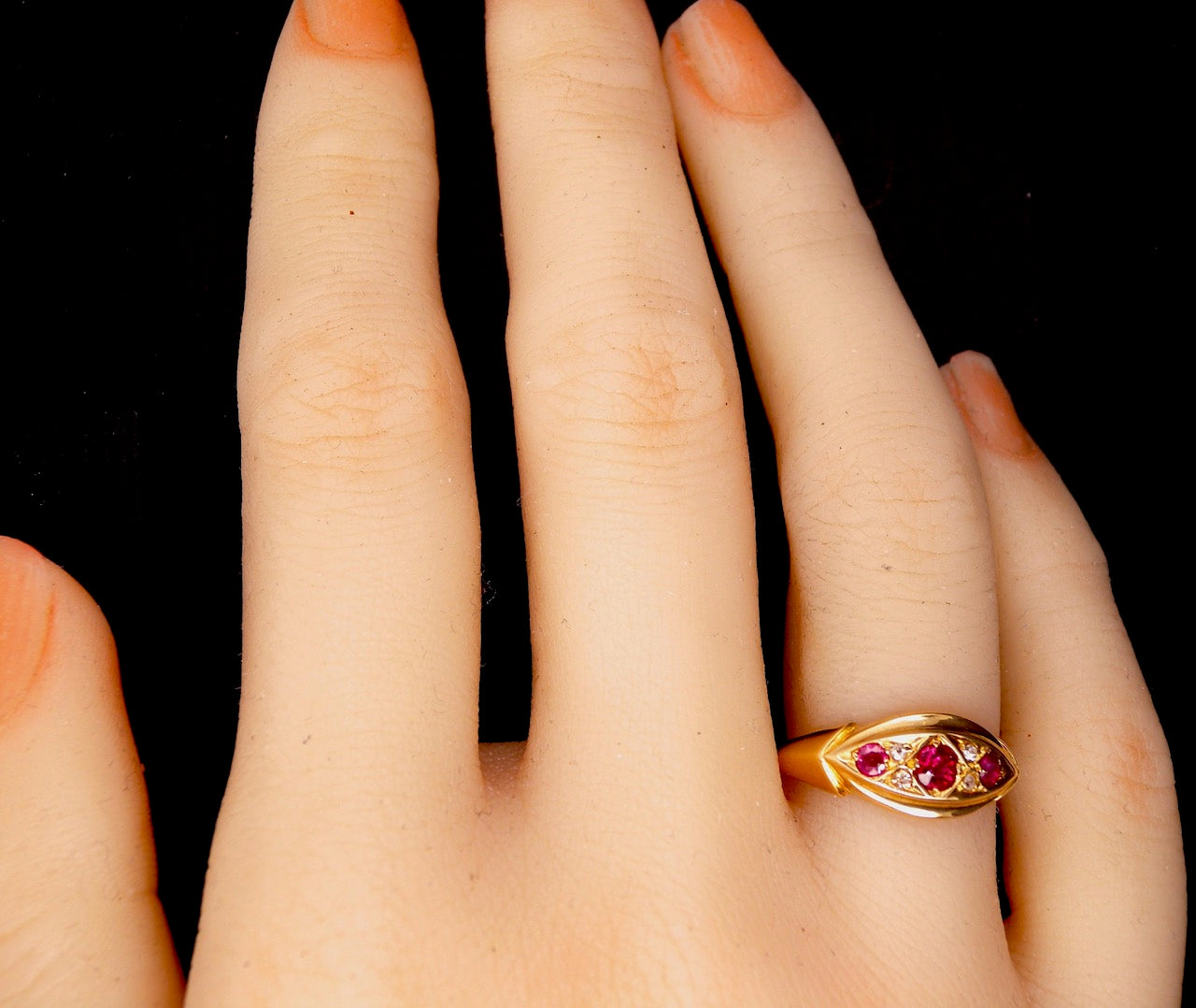 An 18 carat gold ring, hallmarked Birmingham 1917, containing a 3mm (0.10 carat) ruby centre stone and each side two 1.5mm rose cut diamonds and at each end a 2mm (0.03 carat) ruby.