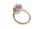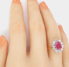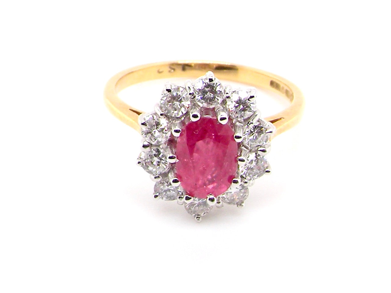 A traditional cluster ring containing an oval pink red ruby 9x6mm (1.75 carats) good clarity with no obvious signs of heat treatment. Surrounded by ten 0.10 carat brilliant cut white diamonds, good colour F-g, clarity VS, claw set into white gold.
