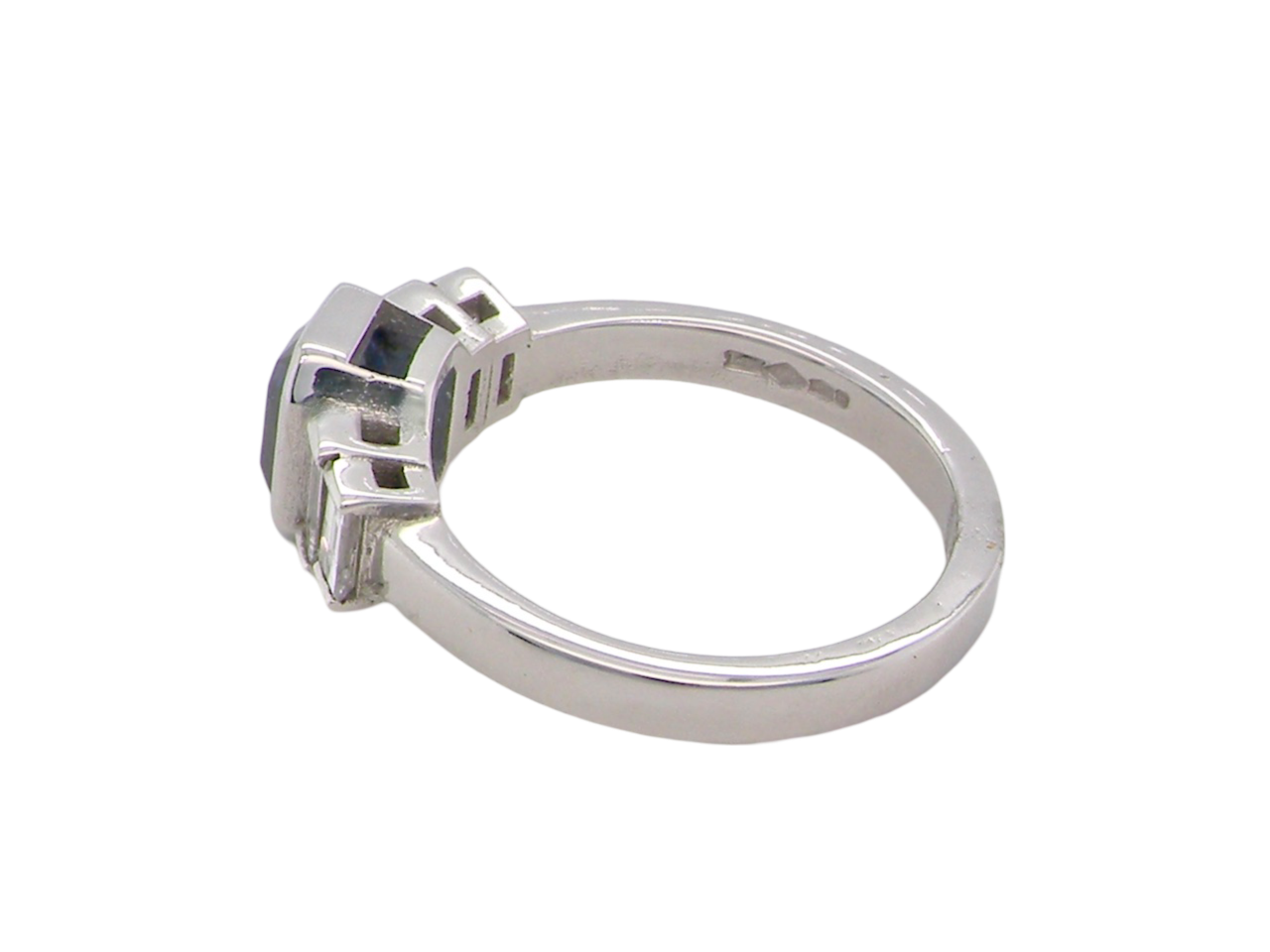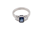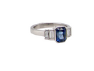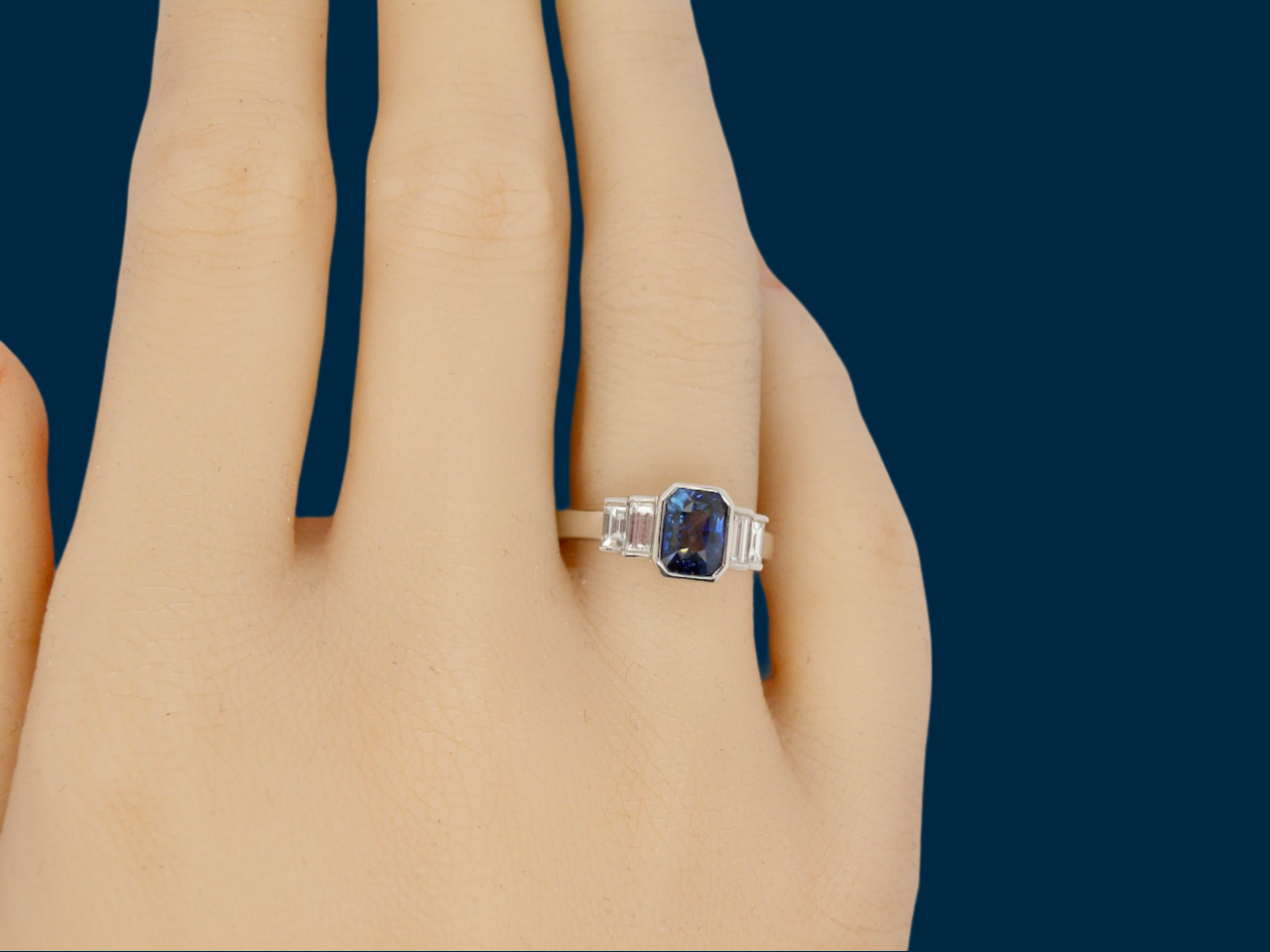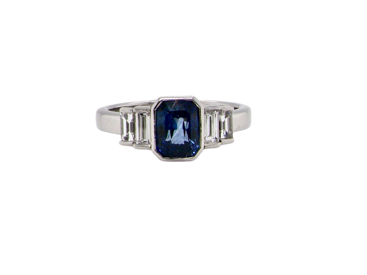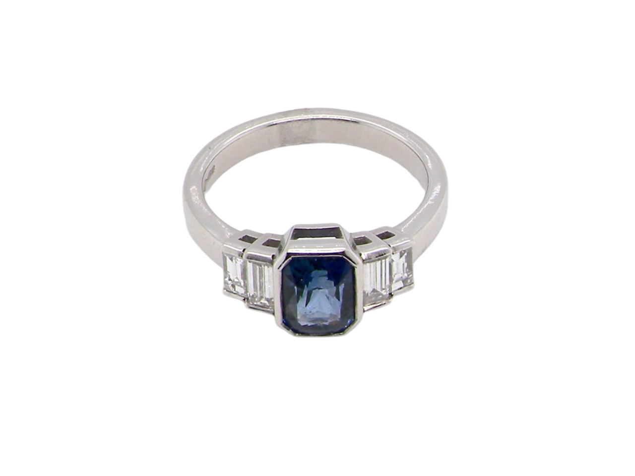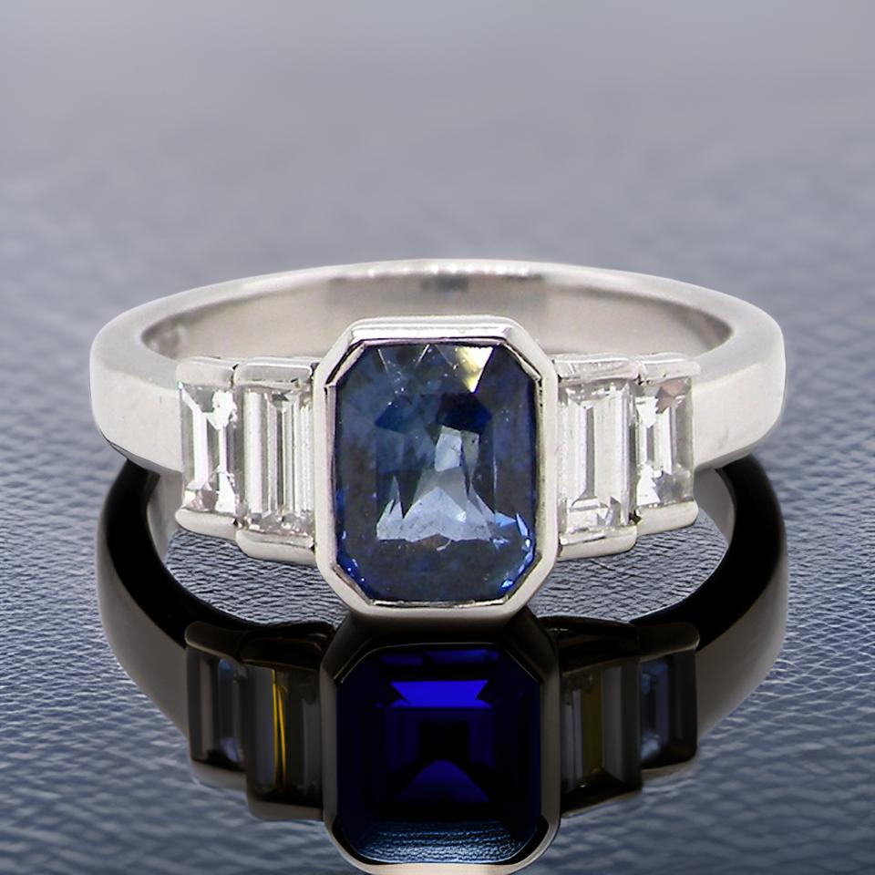 A modernist platinum ring. Features a step cut sapphire centre stone 6.5x4mm (1.55 carats) deep  blue hues with a sparkling refraction from the inside depth.