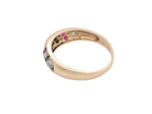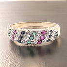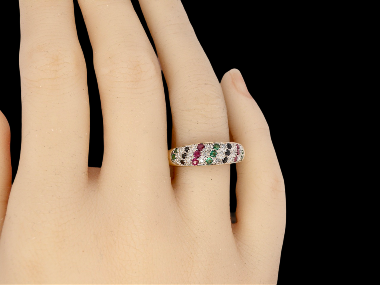 A 9 carat gold dress ring set with a combination of precious gemstones. These all set in slanting rows of twos and threes, a total of seven emeralds, six rubies, and six sapphires, all 1.2-1.4mm each.