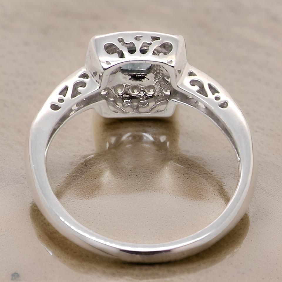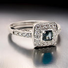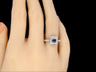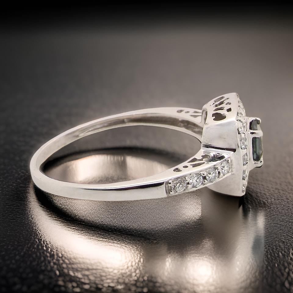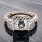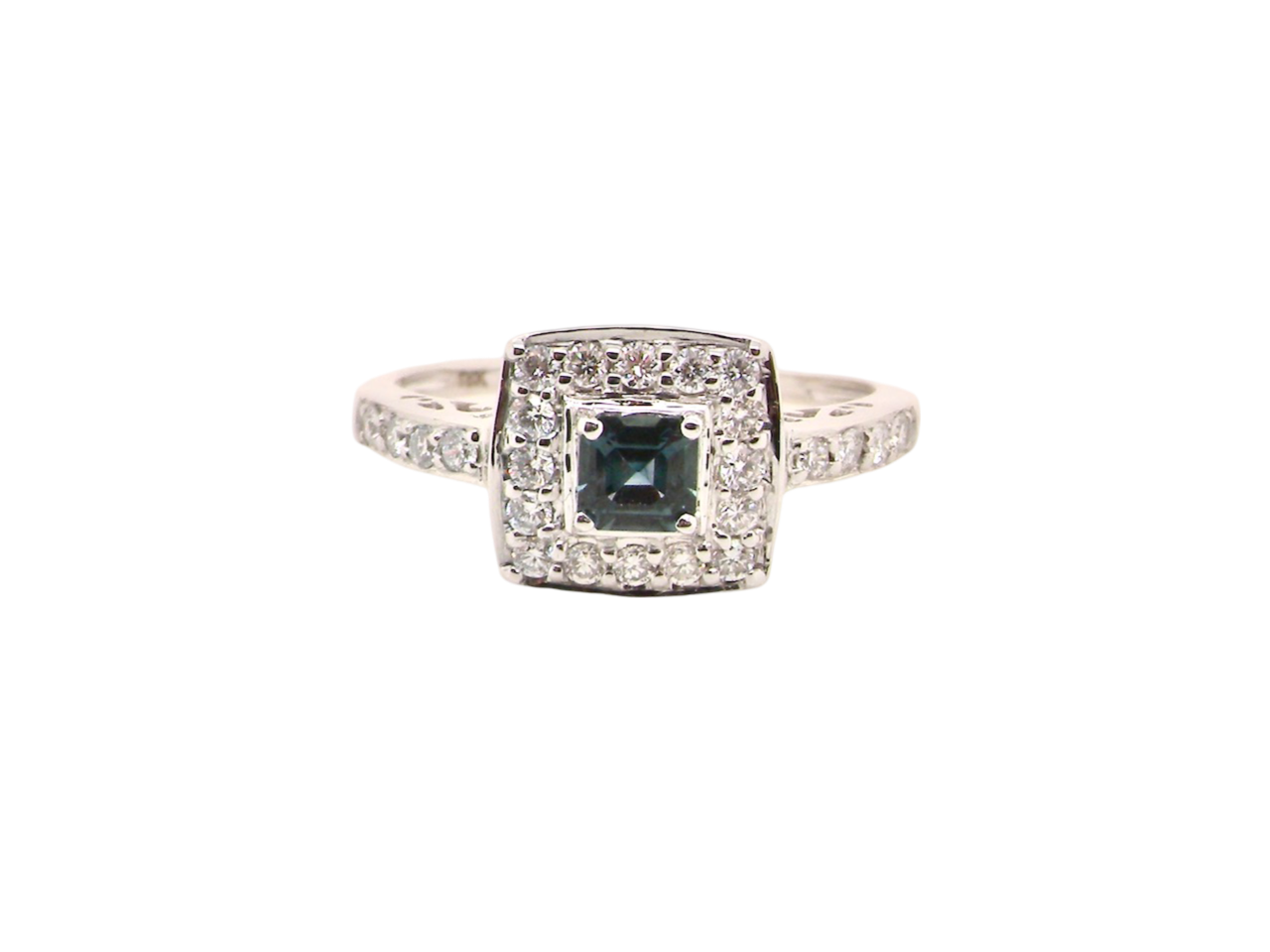 The centre stone is a inky blue sapphire with flashes of brighter blue turned to the light, 4x4mm (0.30 carats) with a surround of small white diamonds, with further diamonds set to each shoulder, colour H-j, clarity Si. Head 9x9mm, depth 3.7mm, weight 2.8grams.