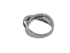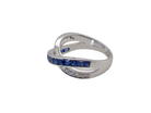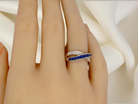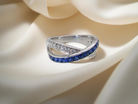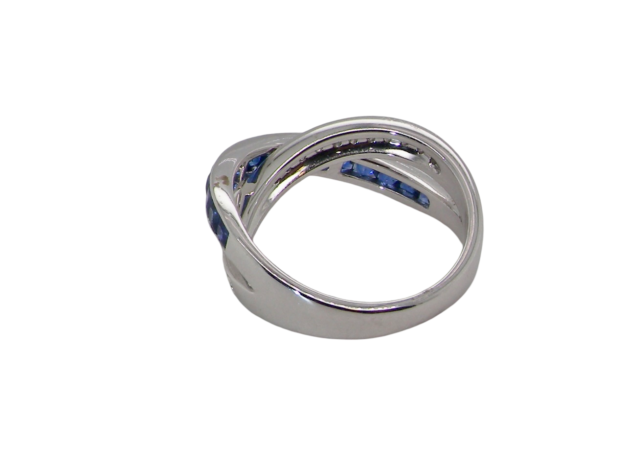 This popular design is a cross over style, one row of calibre cut mid blue sapphires each 2.2mm, fifteen in total, all close set. The diamond row is crafted so it blends under the sapphire band. Fifteen brilliant cut white diamonds in total, each 2mm, colour G-h, clarity Si. Total carat weight estimated at 0.50 carats.