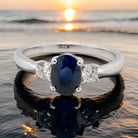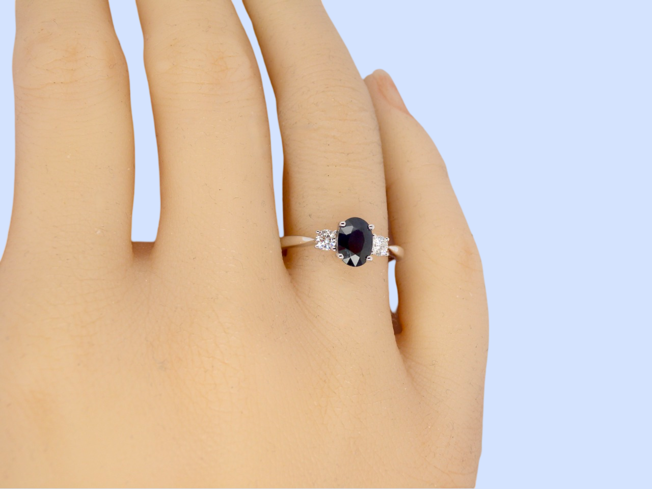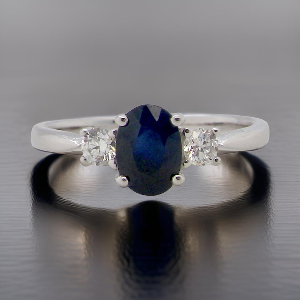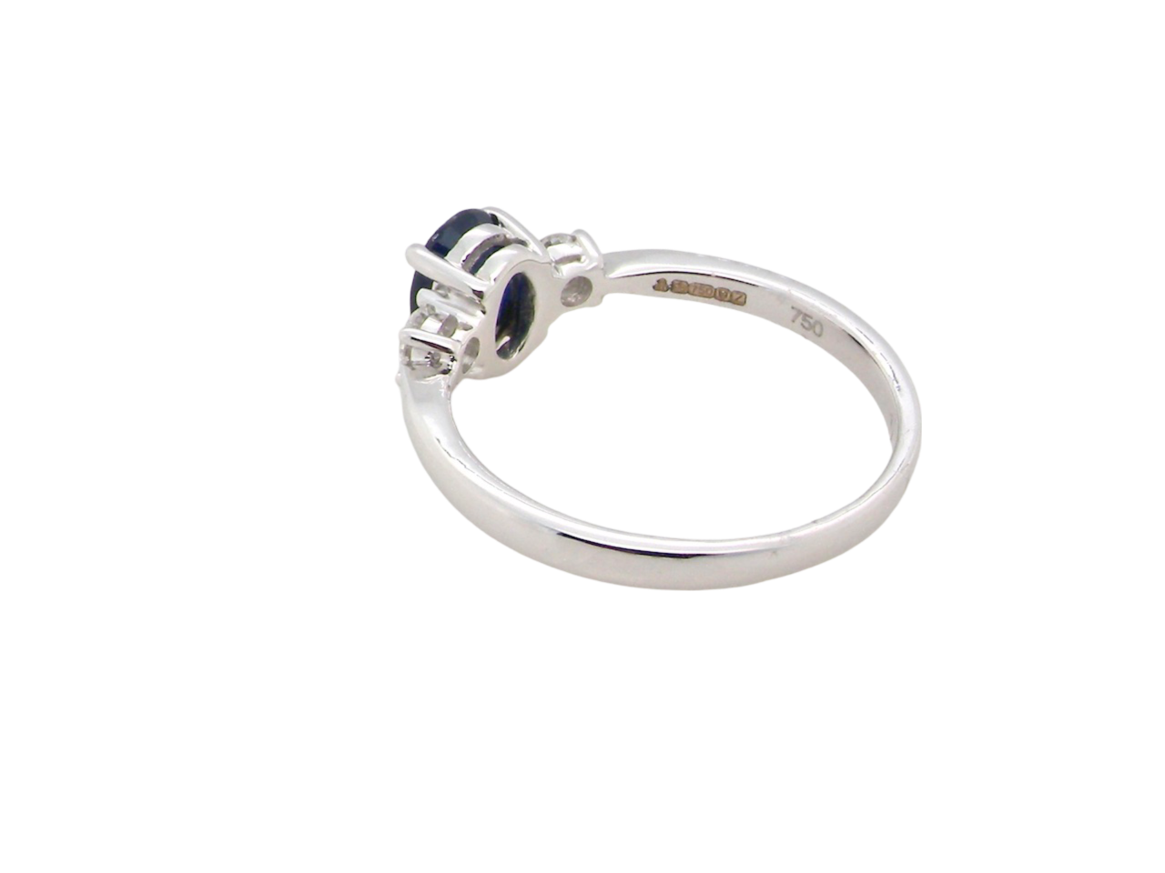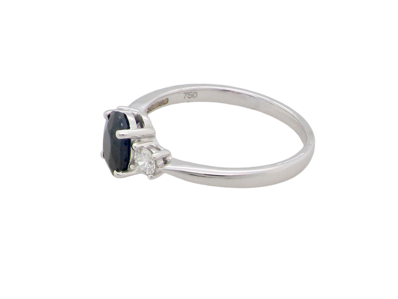 An 18 carat white gold trilogy ring. Centre stone an oval black blue sapphire 7x5mm (1.13 carats)