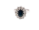 An impressive cluster ring. Set with a dark inky blue oval sapphire centre stone, 8x6mm (1.25 carats) surrounded by twelve brilliant cut white diamonds, 2.8mm each, total carat weight estimated at one carat.
