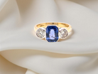 Flanking the sapphire are two brilliant-cut white diamonds, each measuring approximately 4.3mm in diameter and weighing around 0.33 carats. The diamonds are of H–I colour and SI clarity, adding a fine sparkle that complements the central stone.