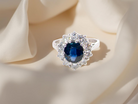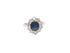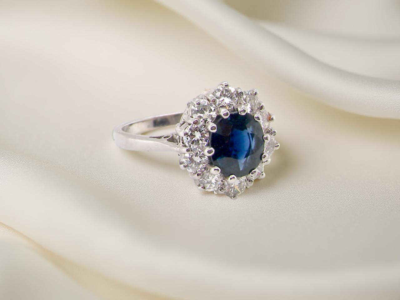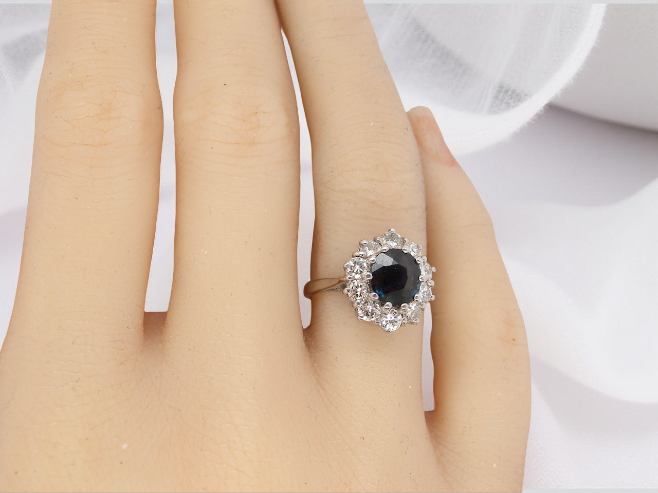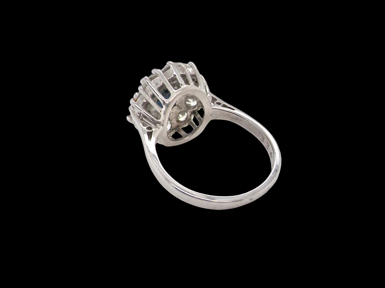 A fine 18 carat white gold cluster ring. Features a large black blue sapphire centre stone 8x6mm (est 1.25 carats)