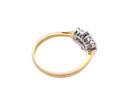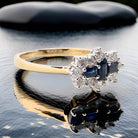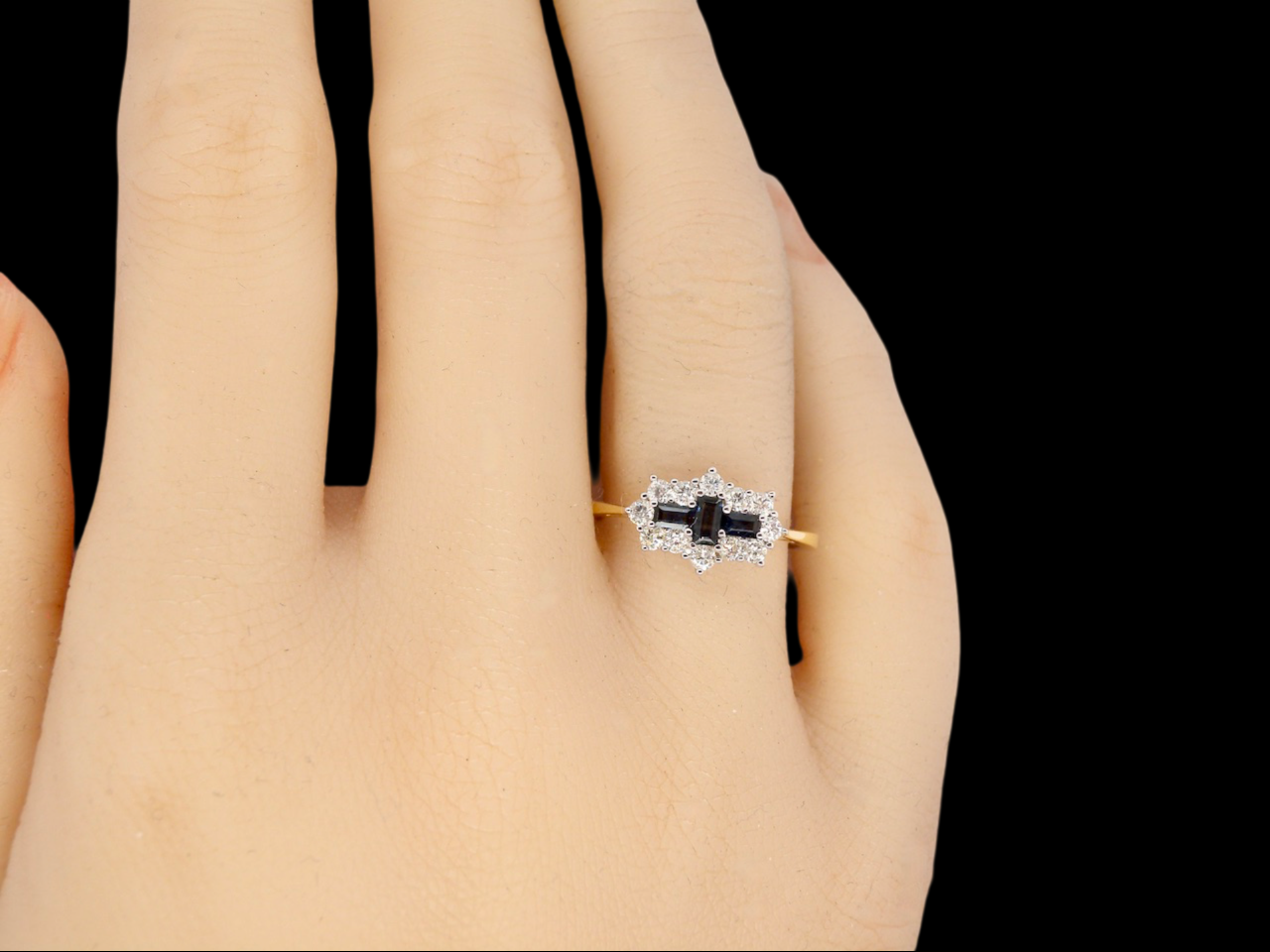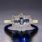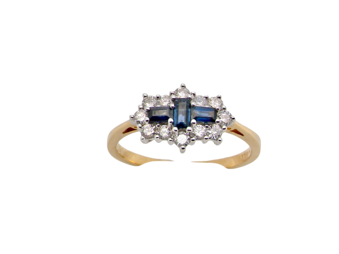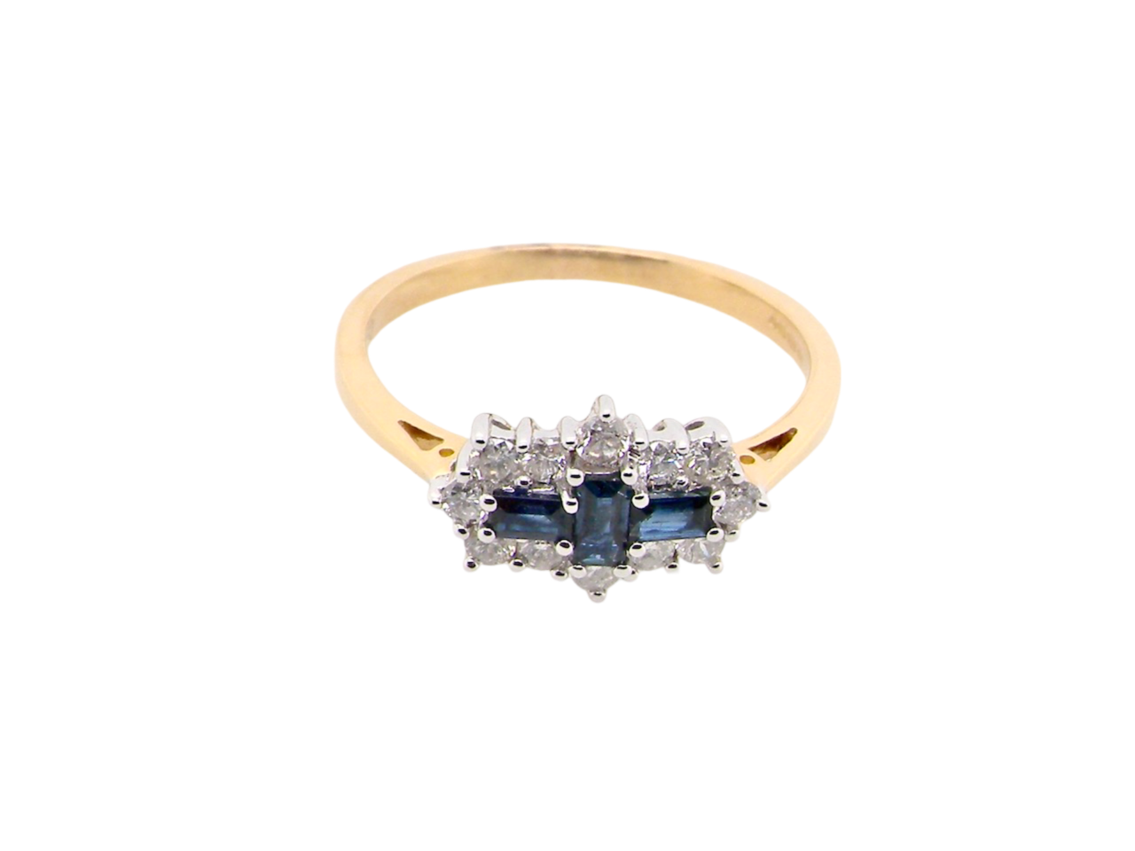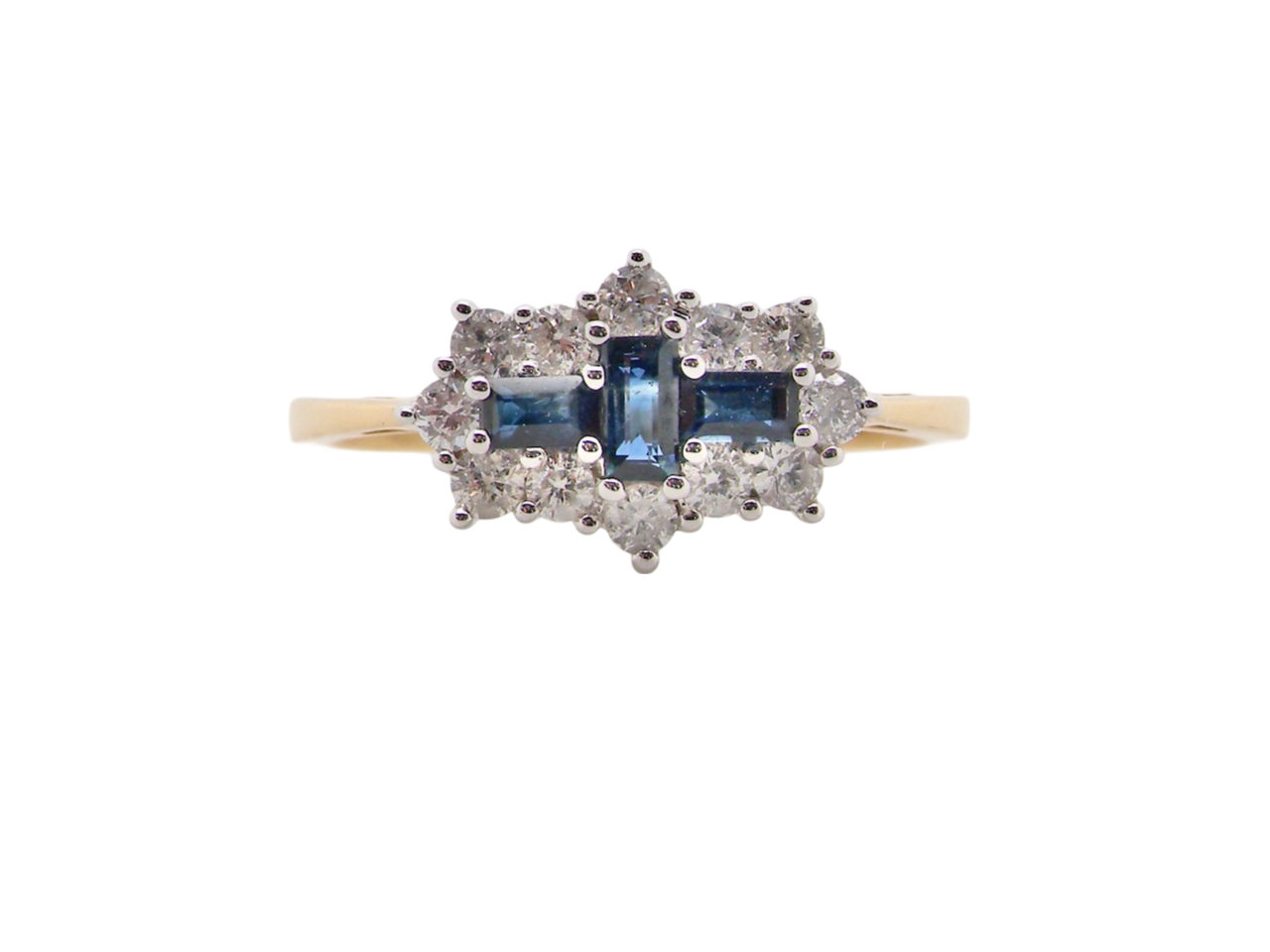 An 18 carat gold cluster ring. Set with three central dark blue sapphires, one 4x3mm, and two 3x2mm (est 0.34 carats)