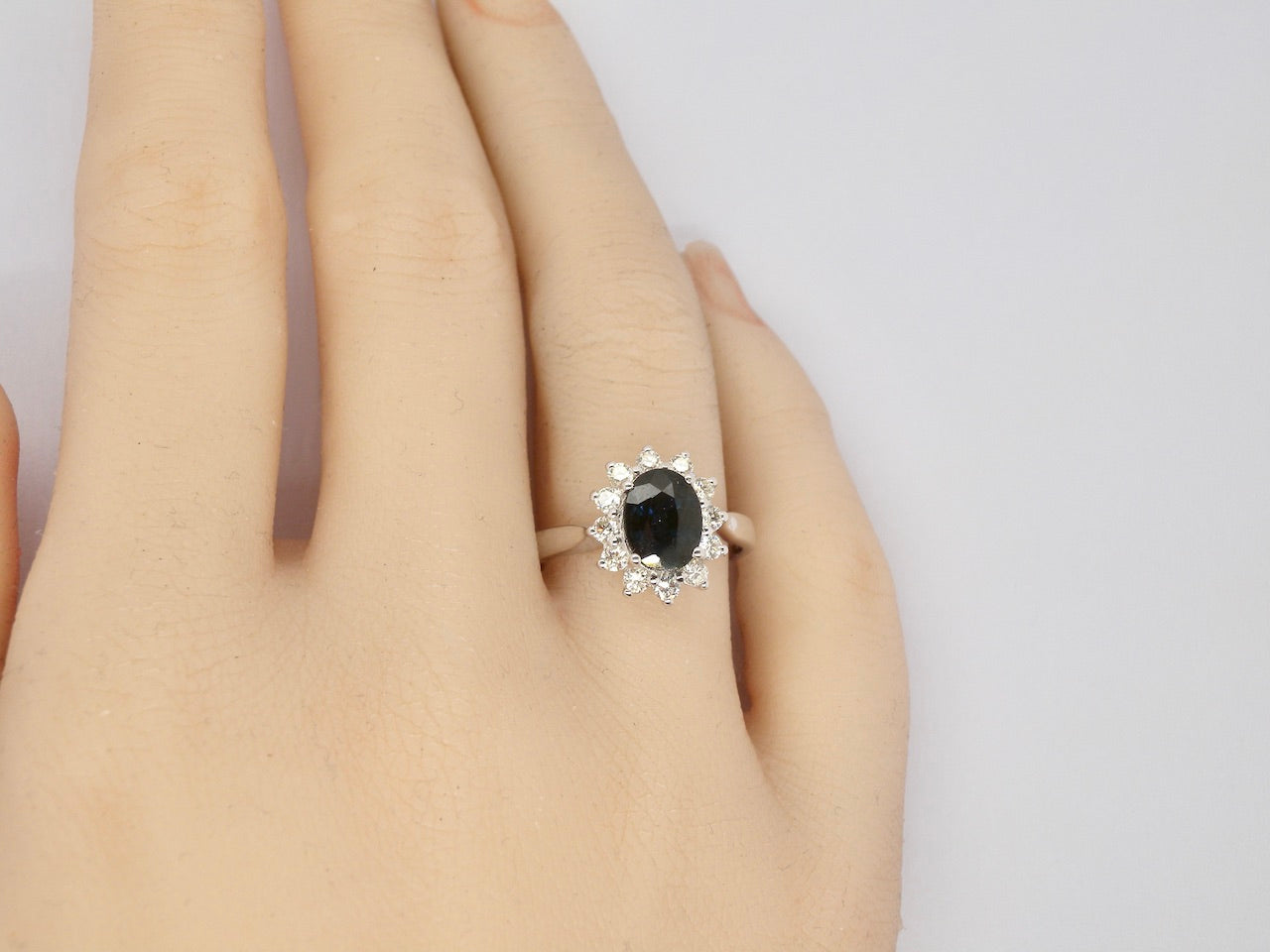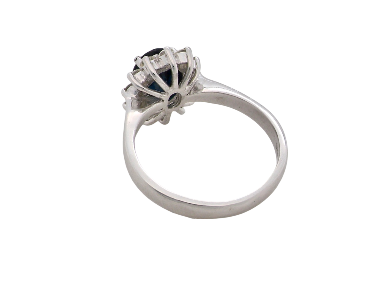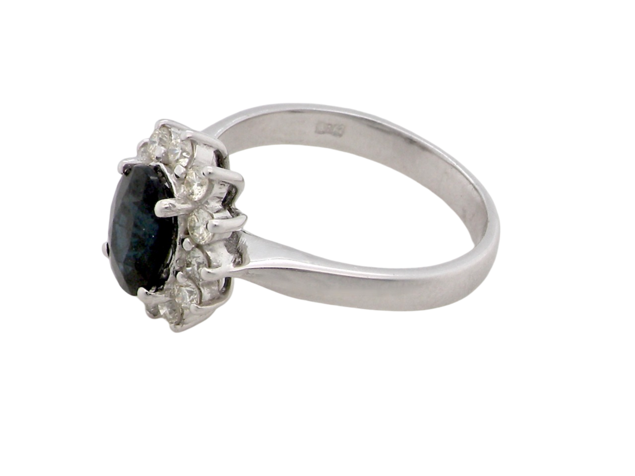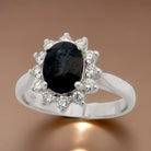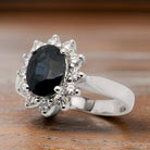 A fine cluster ring set with a inky black blue sapphire 8x6.5mm (est 1.62 carats) four claw setting.