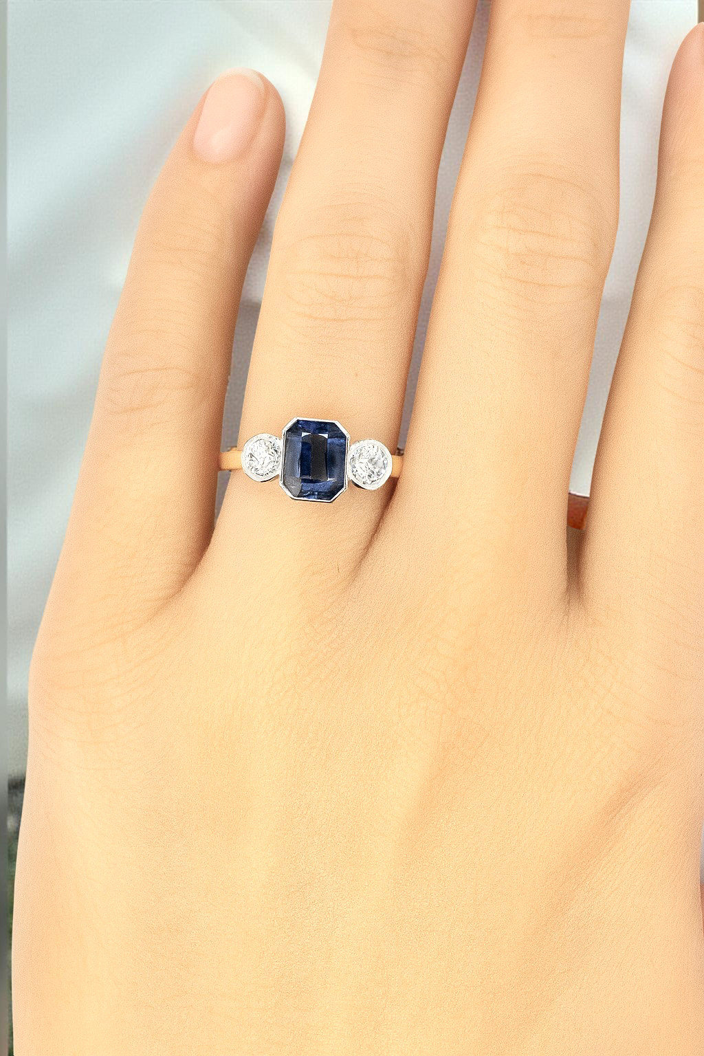 Flanking the sapphire are two brilliant-cut white diamonds, each measuring approximately 4.3mm in diameter and weighing around 0.33 carats. The diamonds are of H–I colour and SI clarity, adding a fine sparkle that complements the central stone.