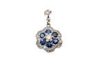 Set with six mid to dark blue sapphires 2.8mm each . Overall diameter 11.2mm, weight each 1.5grams. Suspends from a post, headed by a small 0.05 carat diamond.