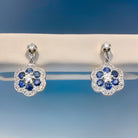 Each daisy shaped and set with sapphires and diamonds. Centre diamond 3mm, with an outer border of eighteen small diamonds. Total diamond content estimated at 0.30 carats (per earring) .
