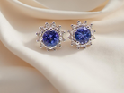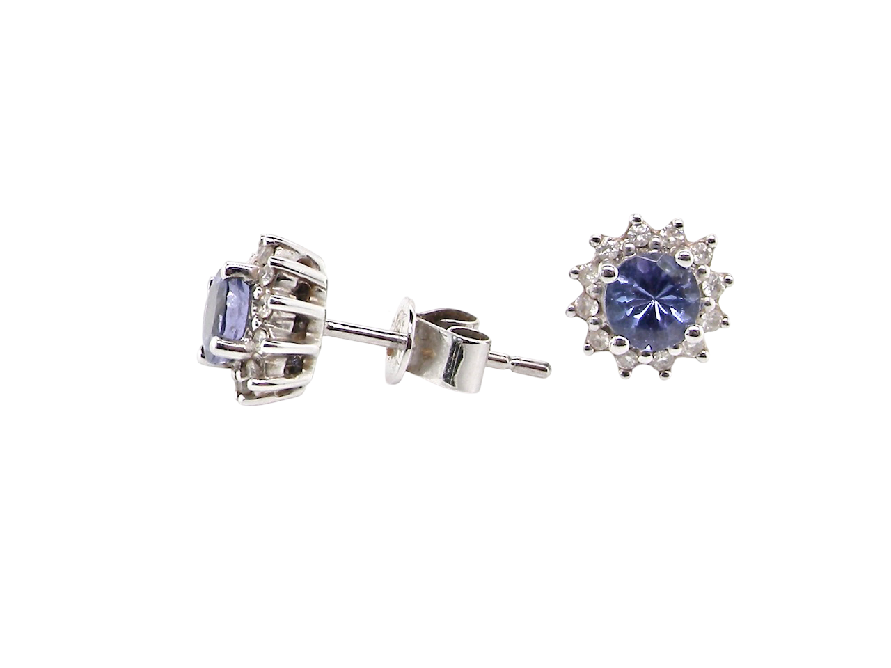A pair of 14 carat white gold stud earrings. Each features a round tanzanite gem stone, 5mm diameter.
