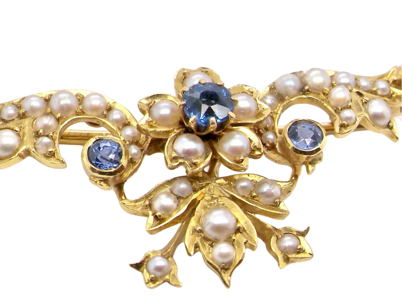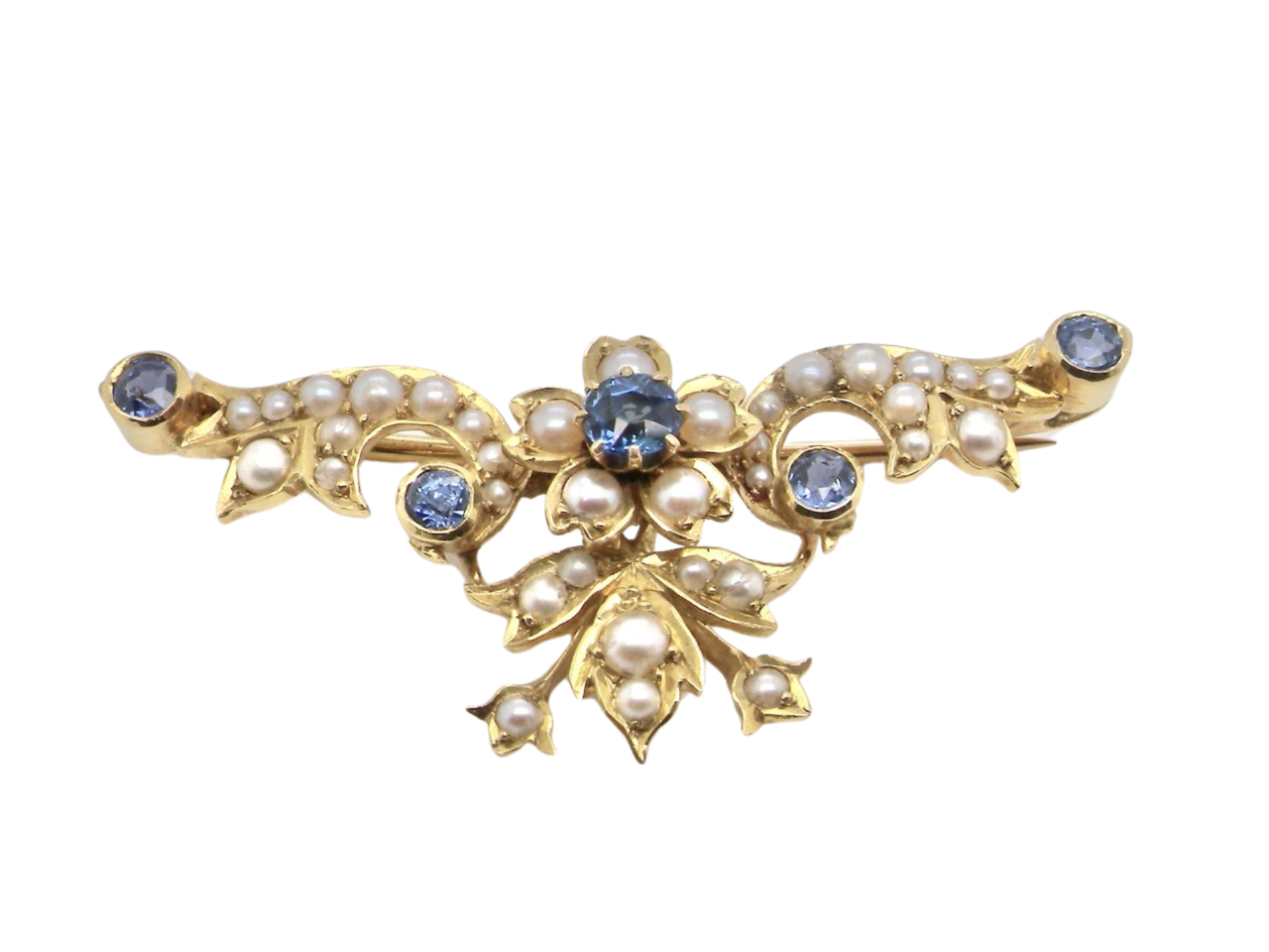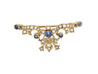 A pretty brooch with a flower design to the centre this set with a cornflower blue sapphire 4mm surrounded by five 2.5mm seed pearls. The rest of the piece is set with a further four x 3mm sapphires and various sizes of small seed pearls.