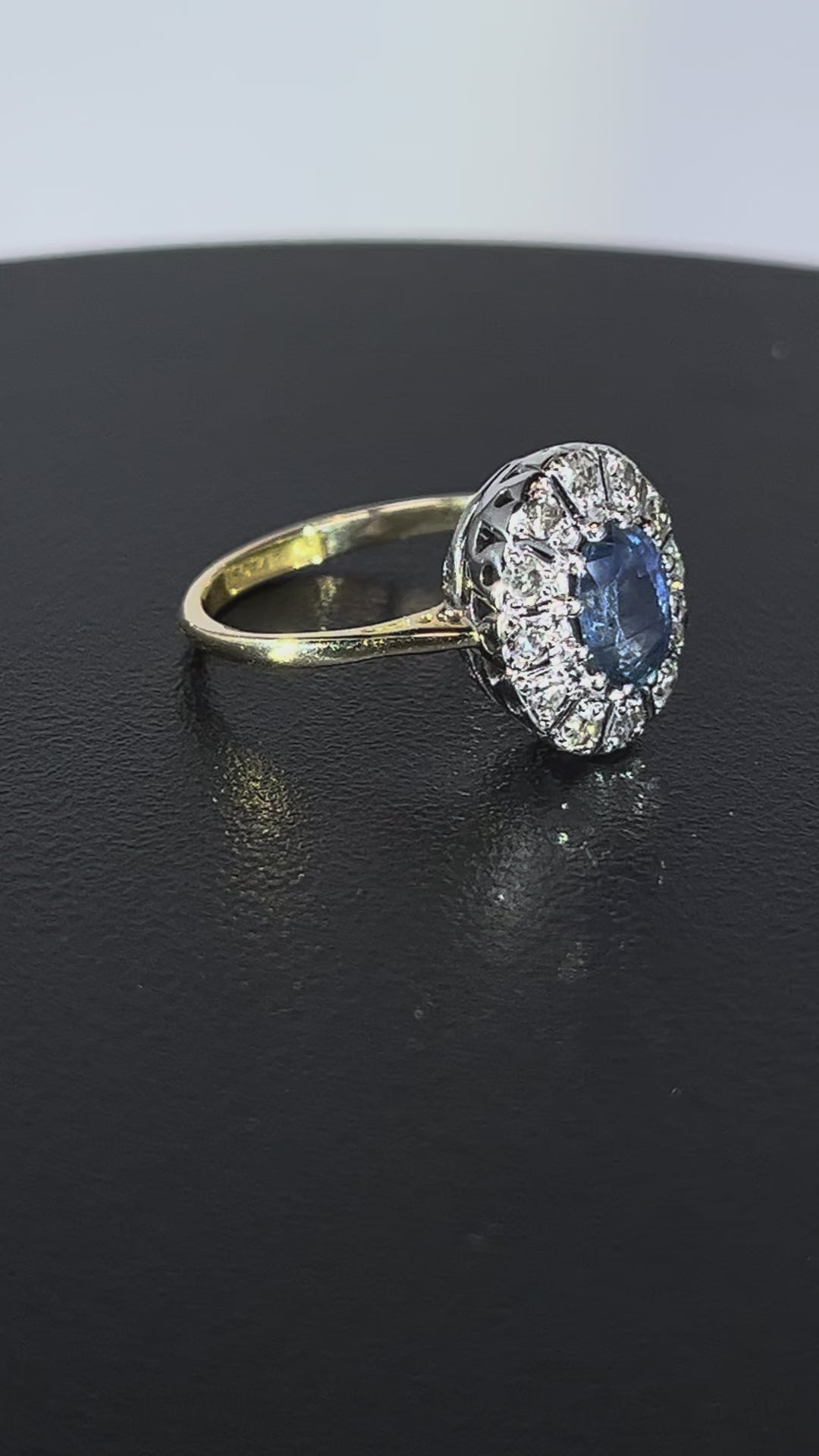 A beautiful vintage cluster ring featuring an oval mid-blue sapphire (approx. 7 × 5 mm), securely claw-set at the centre. Surrounded by a halo of twelve old brilliant-cut white diamonds (approx. 2 mm each, total estimated diamond weight ~0.35 ct), the piece is classically elegant.