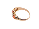 A late Victorian dress ring containing three coral stones, one 4mm, two 3.3mm. Set with two old brilliant cut white diamonds, each estimated at 0.15 carats. Colour I-j, clarity Si.