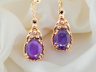 So fifty years old in their making, each is set with a deep purple amethyst stone, 10x8mm, claw set. Mounted in a 9 carat gold setting, fancy openwork at the top, a rope border around the edge. Suspends from a short chain.