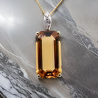 A sherry coloured citrine, rectangular cut 15x8mm, (8.48 carats confirmed as stamped the side of the pendant)