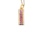 A rectangular 9 carat gold pendant containing seven pink tourmaline stones, square 3.5x3.5mm, channel set in a plain gold border.