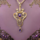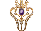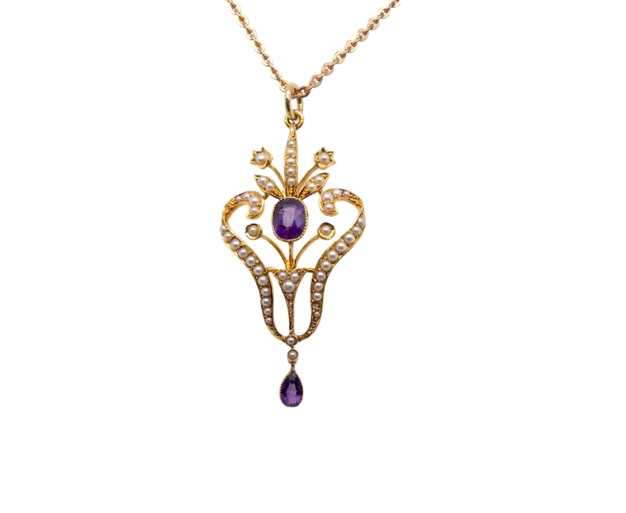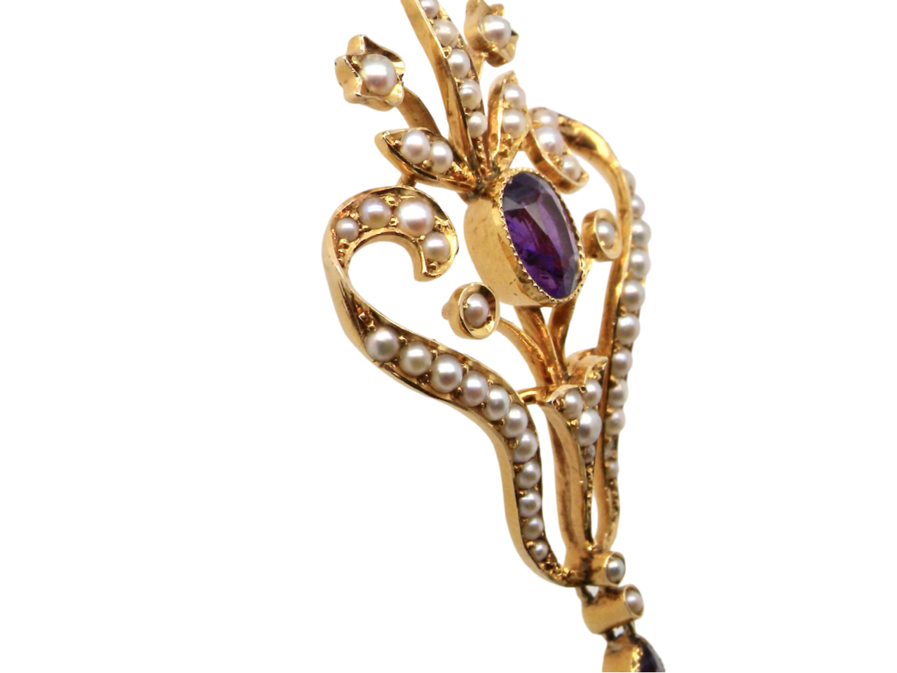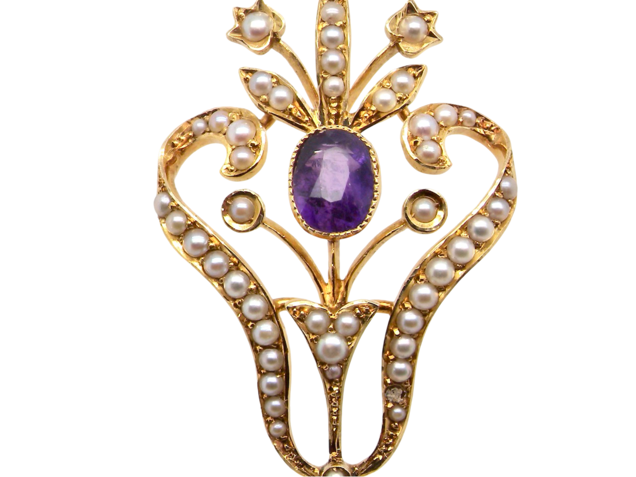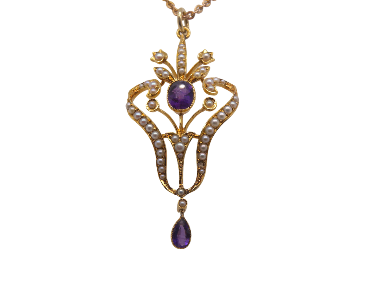 A beautiful Victorian pendant. At the centre an oval amethyst 7x5mm and is surrounded by a large number of seed pearls.