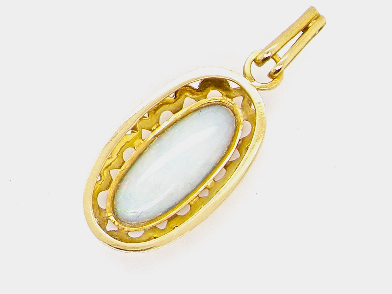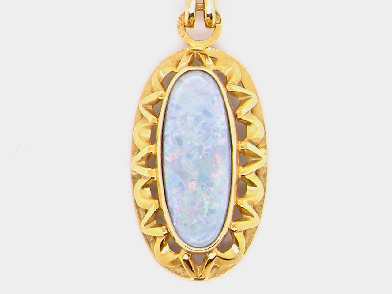 An oval opal with good play of colour, 18x7mm in a fancy openwork setting, 25x18mm.