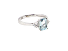 A brand new ring. A three stone 18 carat white gold ring. The centre stone a rectangular aquamarine 7x5mm (0.87 carats) clean clear sky blue colour.
