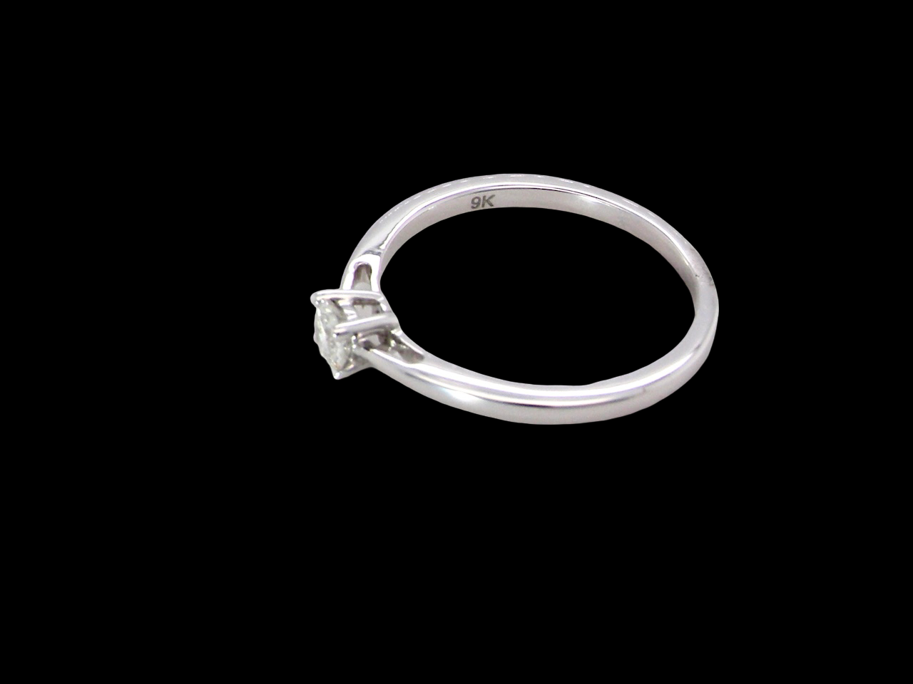 The diamond measures just under a quarter of a carat, colour G-h, clarity Si. Simply set into four claws, 9 carat white gold, with a British hallmark