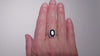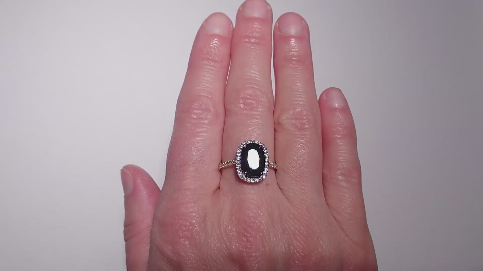 A striking cluster ring featuring a captivating ink-black blue sapphire, measuring approximately 11 × 7 mm, set at the centre. The sapphire is encircled by twenty-five 1.5 mm brilliant white diamonds, with an additional seven 1.5 mm diamonds set into each shoulder.