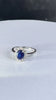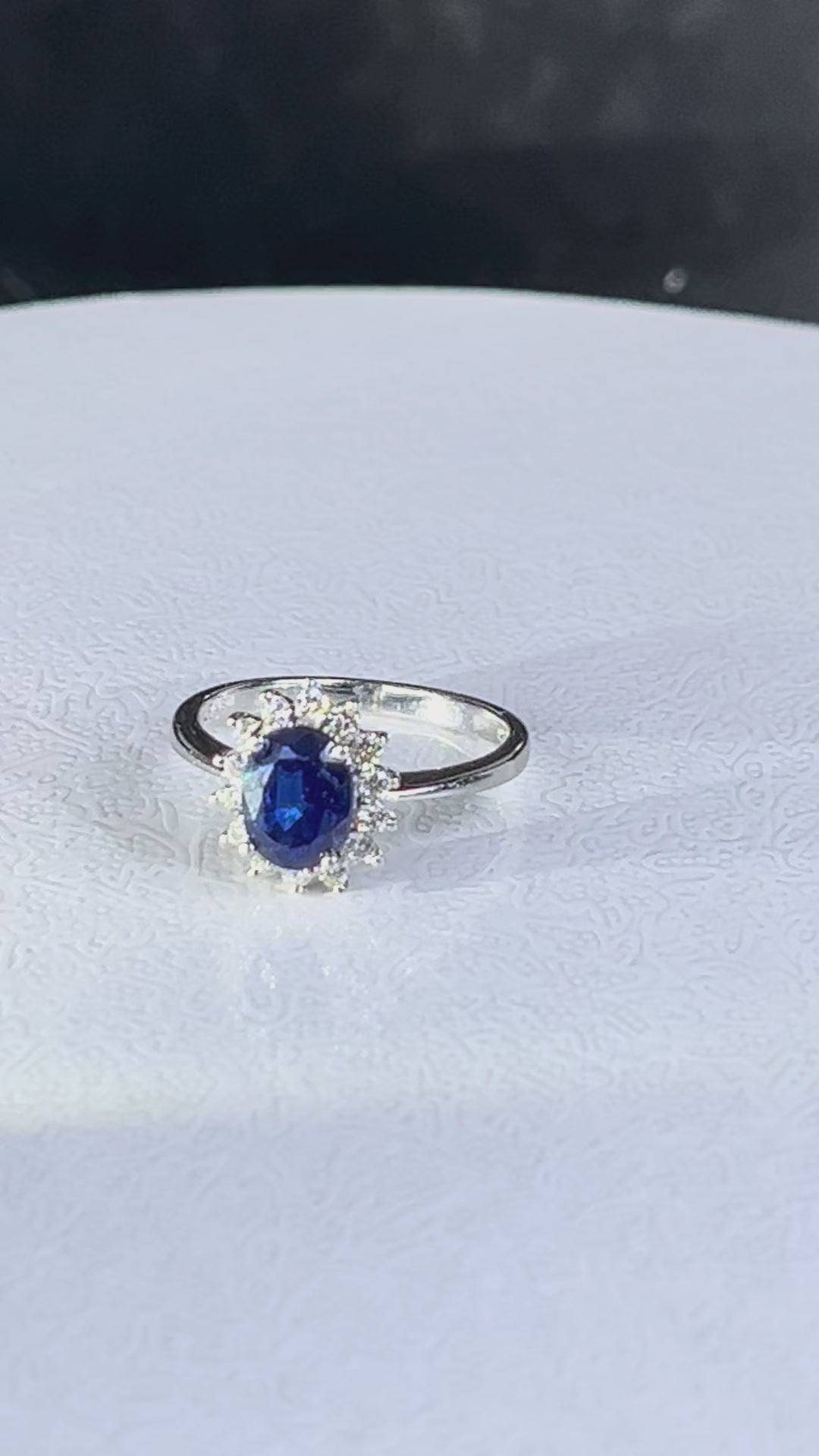 An iconic cluster ring featuring a striking mid–dark blue oval-cut sapphire at its centre, measuring approximately 8 × 6 mm (estimated 1.25 ct).