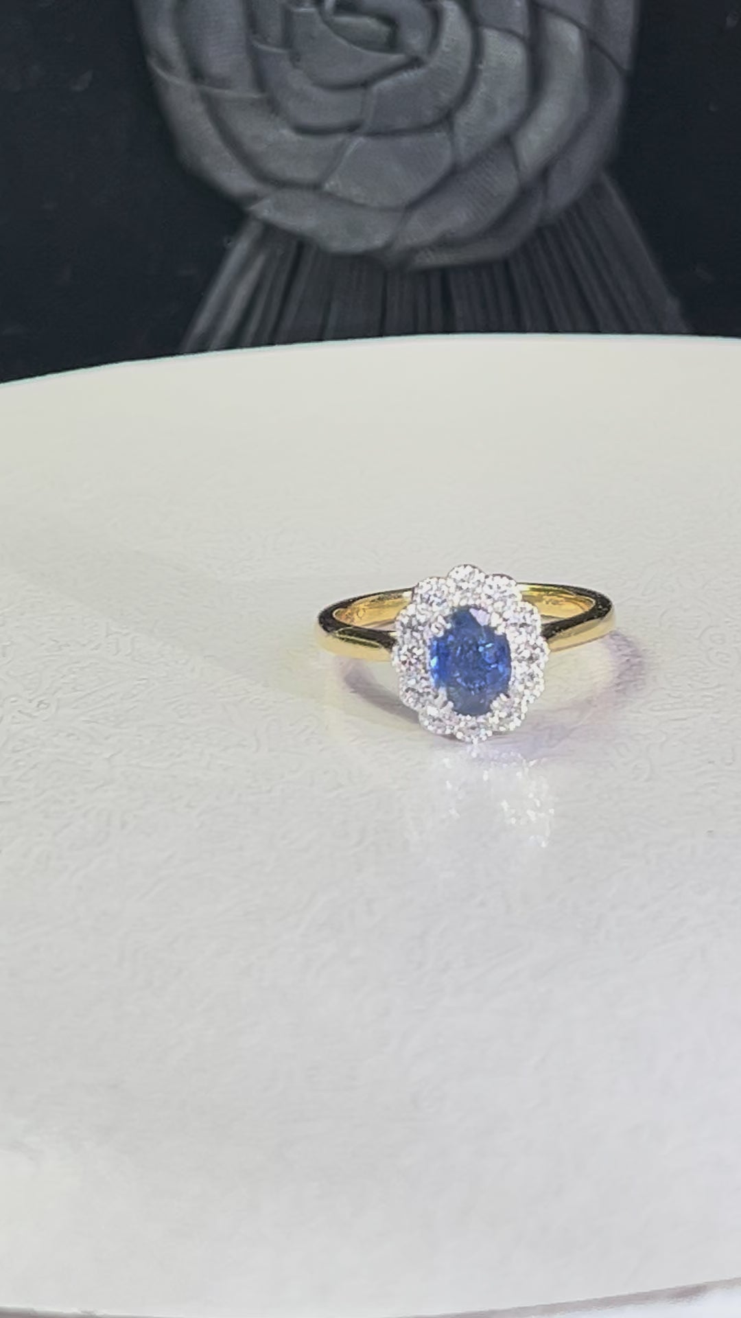 A beautiful cluster ring featuring an oval-cut mid to dark blue sapphire measuring 7 × 5 mm (approximately ¾ carat). The sapphire is complemented by a striking outer halo of twelve brilliant-cut white diamonds, each 2 mm in size, with a total diamond weight of approximately 0.25 carats.