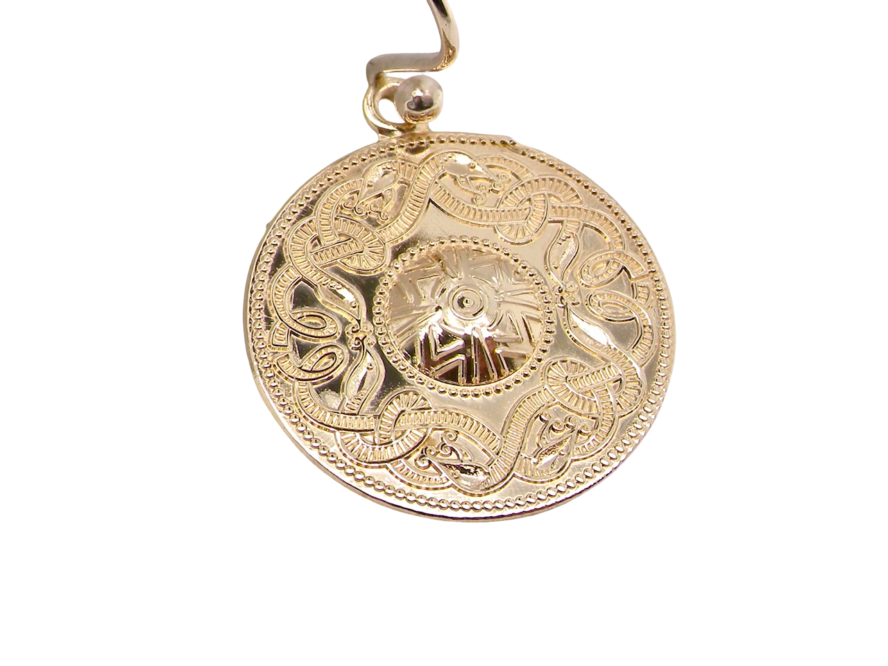 The pattern is similar to a Viking shield. Diameter 20mm and suspends from a hook  fitting. Weight each 3 grams.