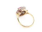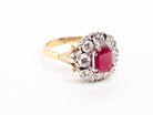 An impressive cushion shaped cluster ring containing a rectangular ruby centre stone 7x6mm (est 1.3carats) set into eight claws. Surrounded by eight x 3.5mm brilliant cut white diamonds, 0.15 carats each to a total estimated weight of 1.20 carats.