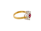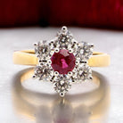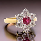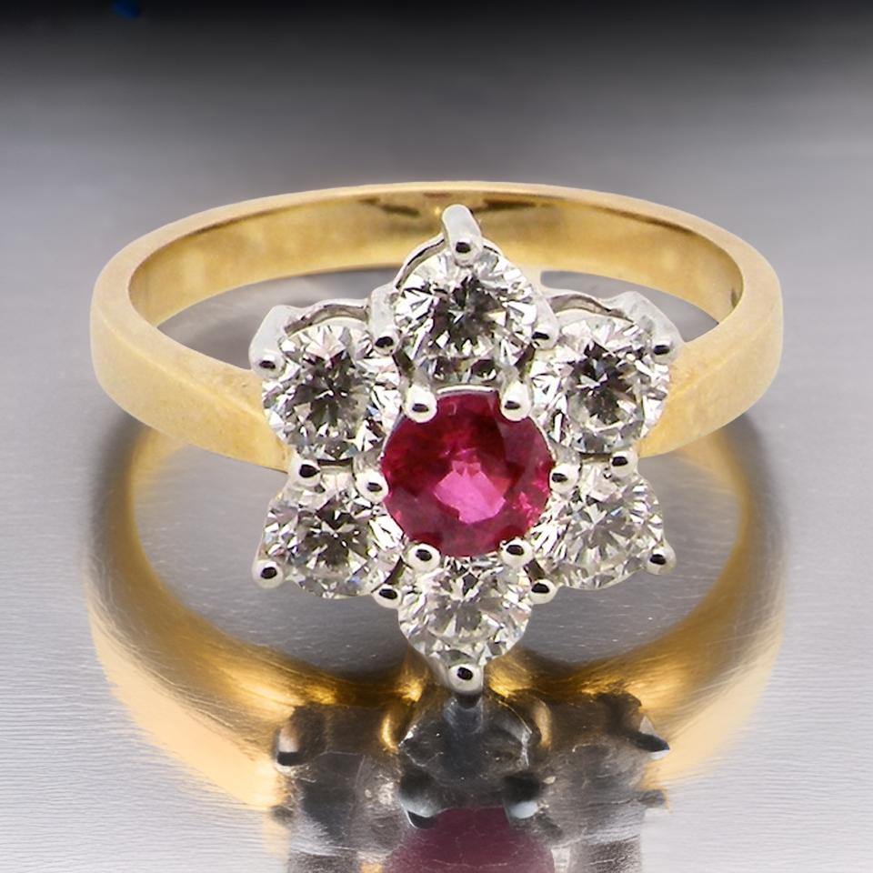 A beautiful cluster gem ring and set with a single round ruby centre stone which measures just over 5mm and a carat value estimated at 0.55 carats and retained by six claws.
