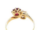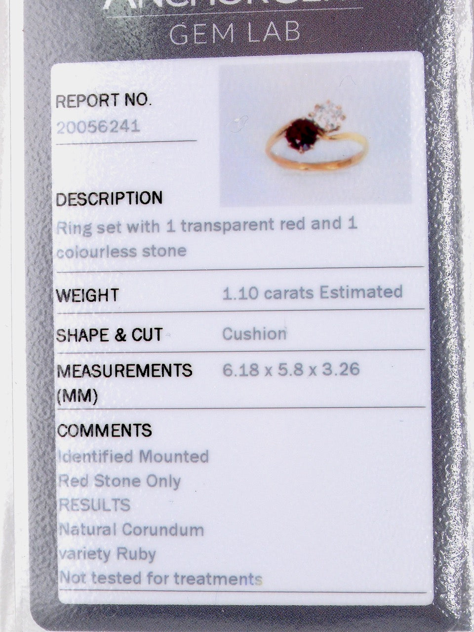 A two stone cross over style ring. The ruby measures 6.18x5.8x3.26mm (1.10 carats) with a Gem Lab report suggesting a natural ruby , claw set.