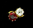 The diamond is an old brilliant cut, white colour F-g, clarity Si. Size 6..5mm (one carat) estimated. Claw set. Both stones are slight cushion shaped. Head 12x10.5mm, weight 2.9grams. Shank stamped 18CT, tests as 18 carat gold, no hallmark as period estimated at 1920-1930.