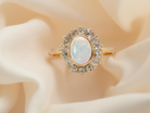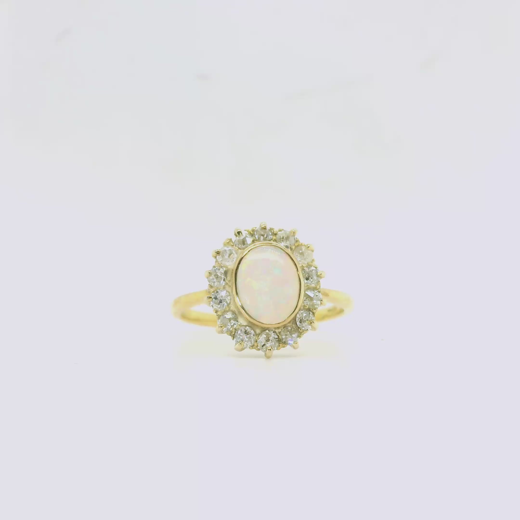 An exceptional ring which has an oval white opal to the centre 6.5x6mm, rub over setting. Good colour play on the stone.