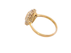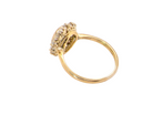 Complimented by an outer border of fourteen old cut white diamonds, each 2mm to an estimated total of 0.40 carats. Colour i-j, clarity Si3-P1. All set in yellow gold, testing as 18 carat.