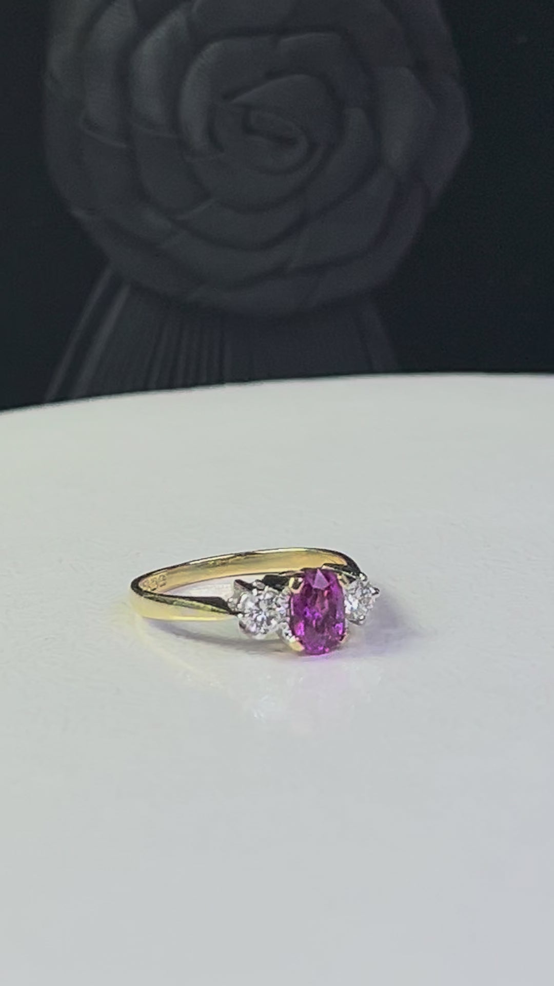 At the centre sits an oval pink sapphire measuring approx. 6.5 × 4.5 mm (estimated 0.65ct), displaying deep raspberry-pink to red hues. The ruby is securely claw-set and framed by two round brilliant-cut white diamonds, each approx. 3 mm(approx. 0.10ct each), graded H–J colour with SI clarity.
