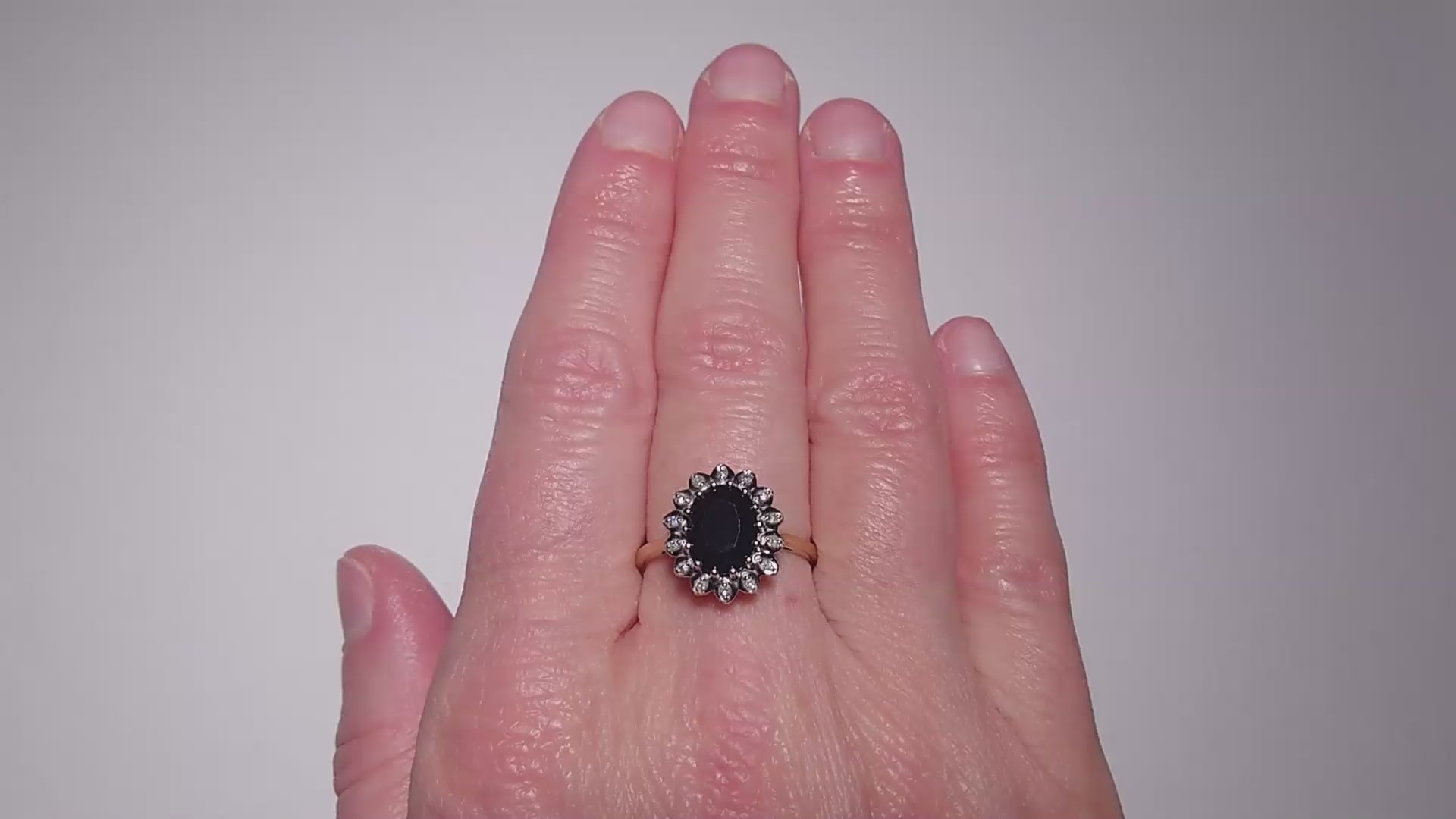 A timeless cluster ring featuring a deep ink-black blue sapphire (9x7mm, claw set) at its centre. The sapphire is encircled by a halo of fourteen brilliant-cut diamonds (1.5mm each), set in white gold, with a total diamond weight of 0.20 carats.