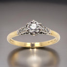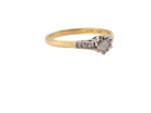 Shoulders are both set with tiny rose cut diamonds, set into platinum. The band is 18 carat yellow gold, hallmarks for London 1966. Weight 3.4grams.
