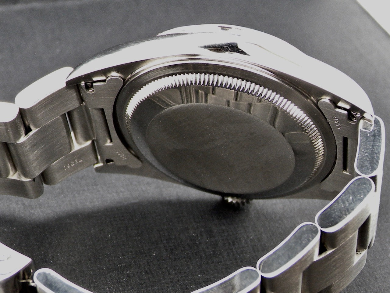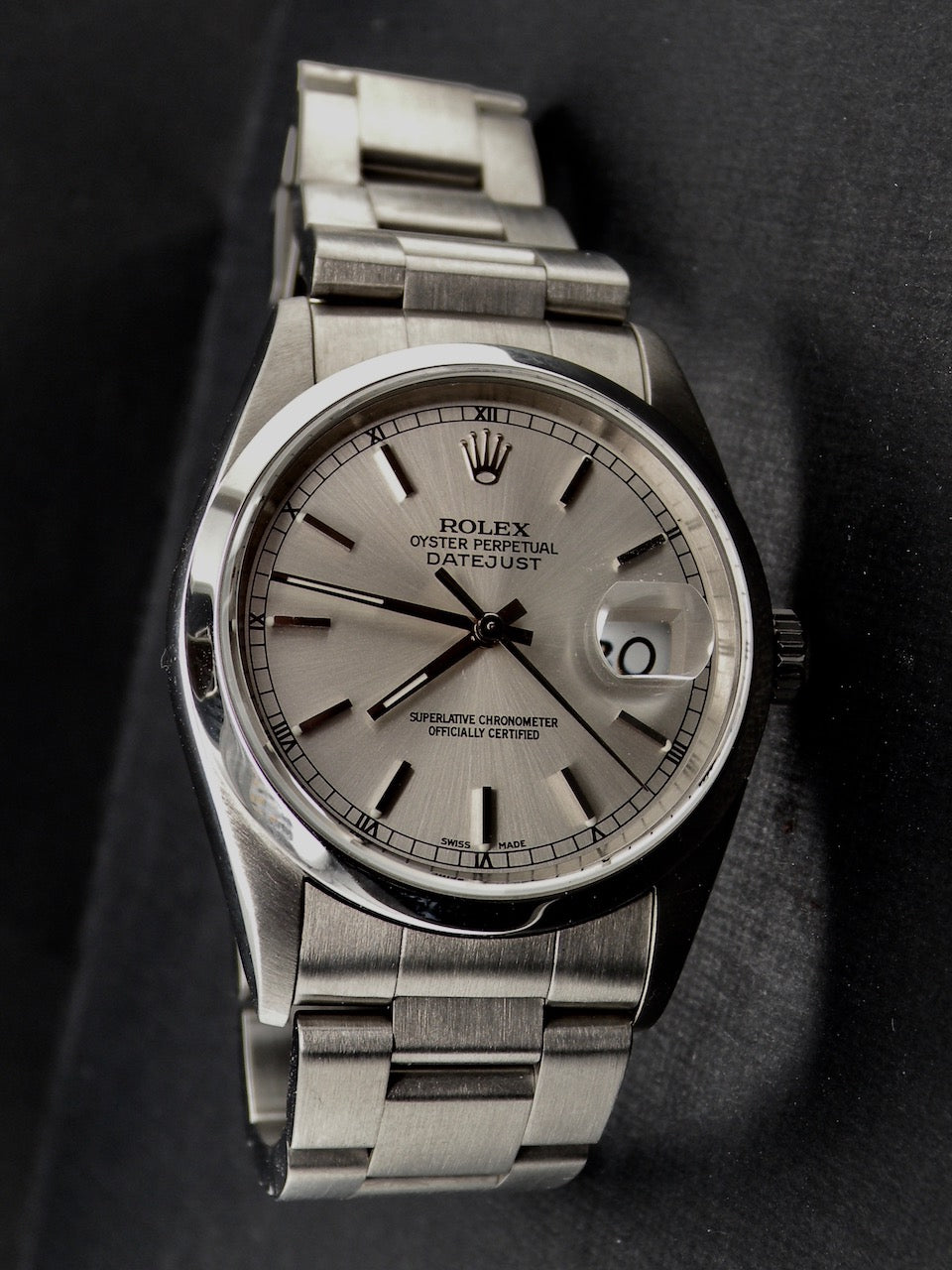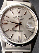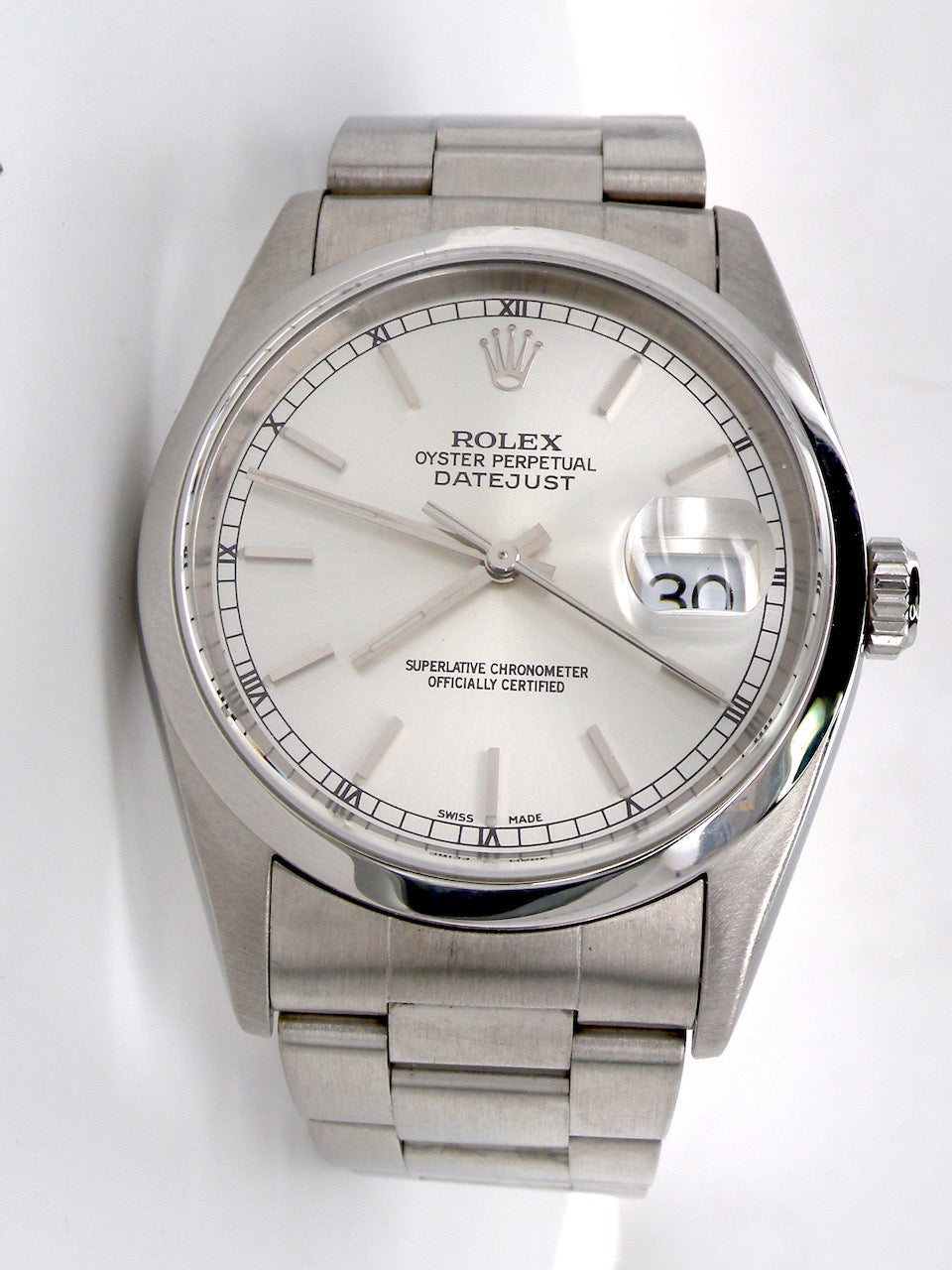 Rolex logo on a crown. Stainless steel smooth bezel. Acrylic crystal with cyclops magnifier. Silver dial with raised baton hour markers. Date window at 3 o'clock aperture. Stainless steel oyster bracelet with fold over clasp. Fits 7 1/4" wrist. Year 2001.