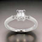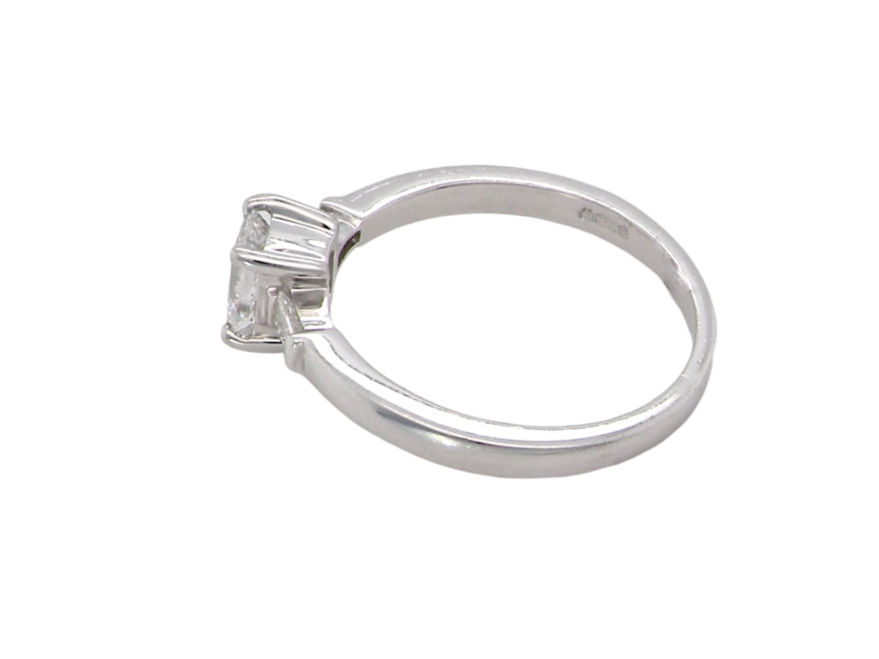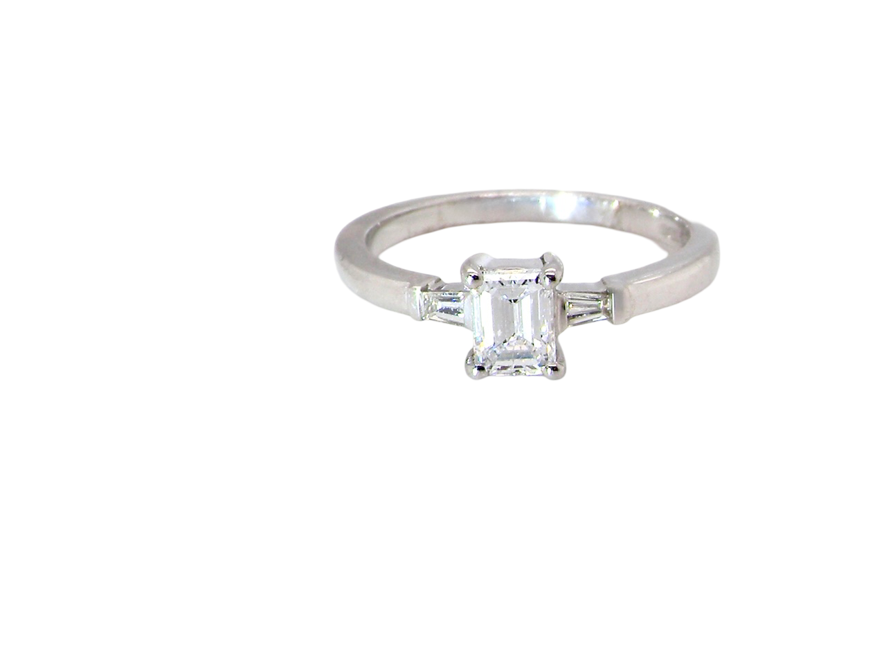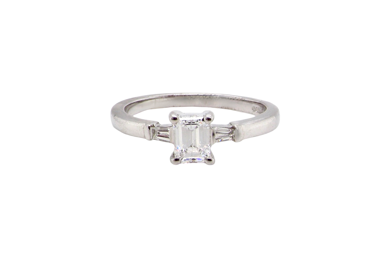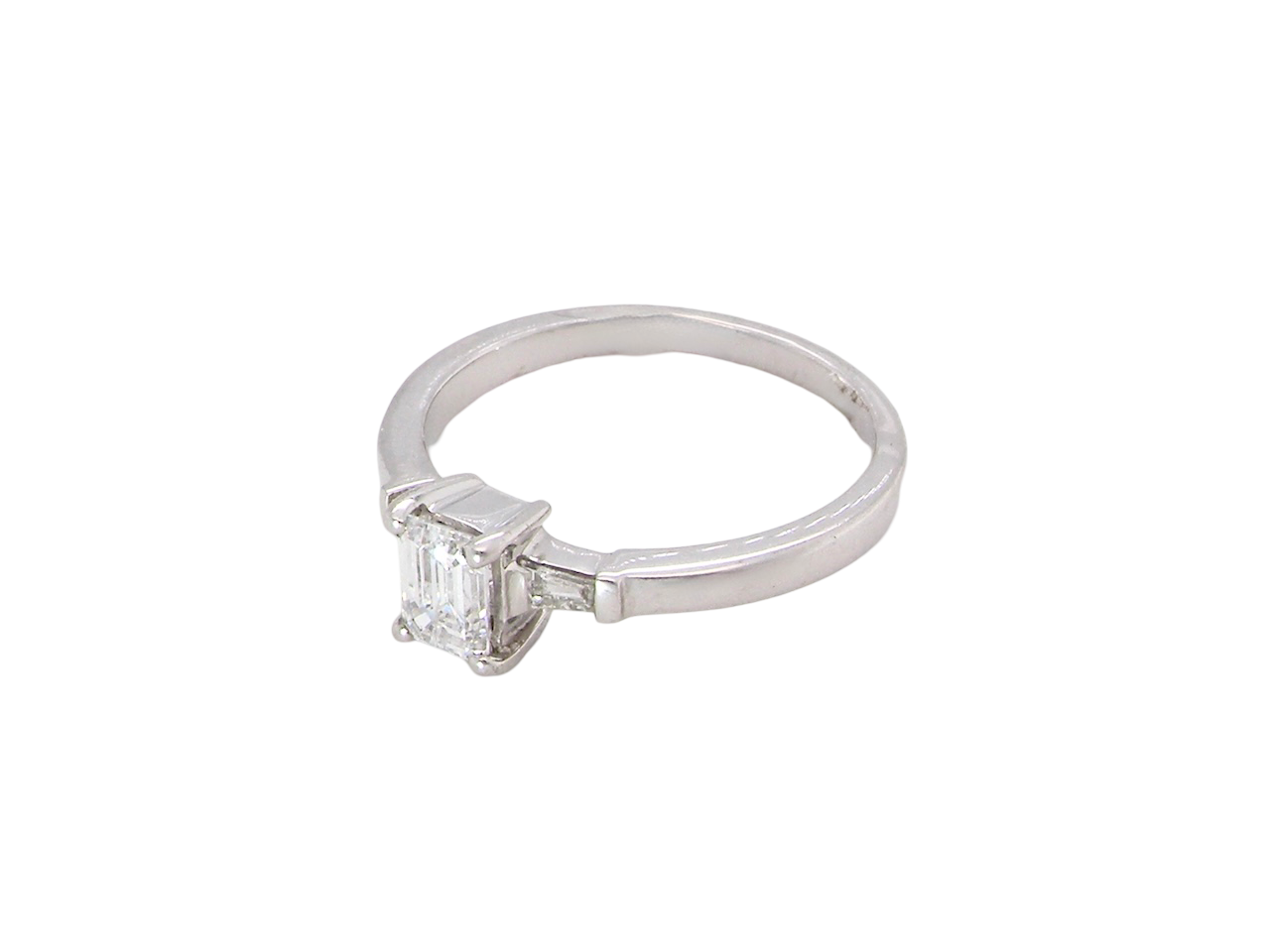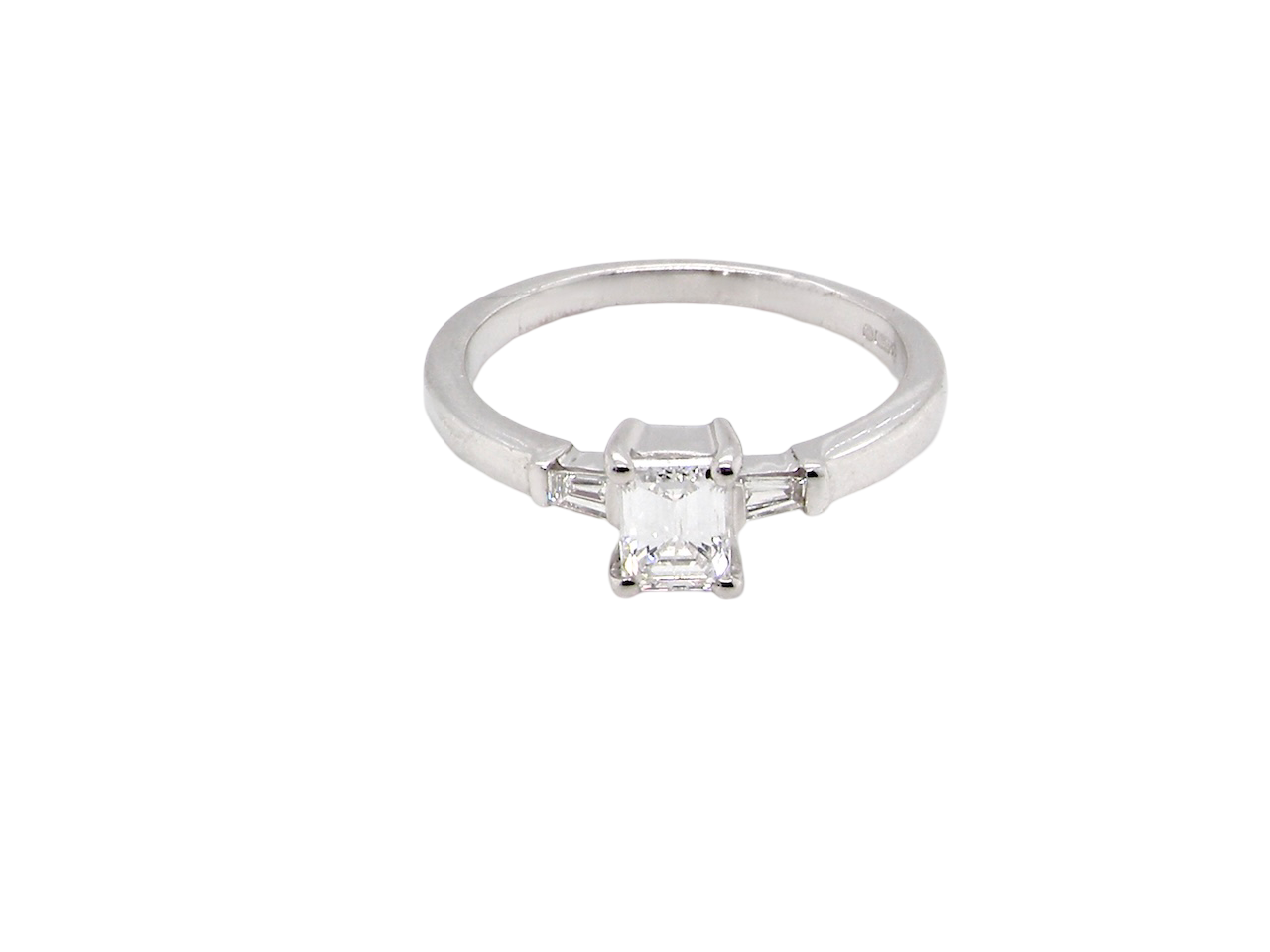 A fine trilogy ring. The centre stone an emerald cut diamond, 5.3x4mm (0.45 carats), colour G+, clarity Si2. Each side a tapered cut diamond 0.08 carats each.