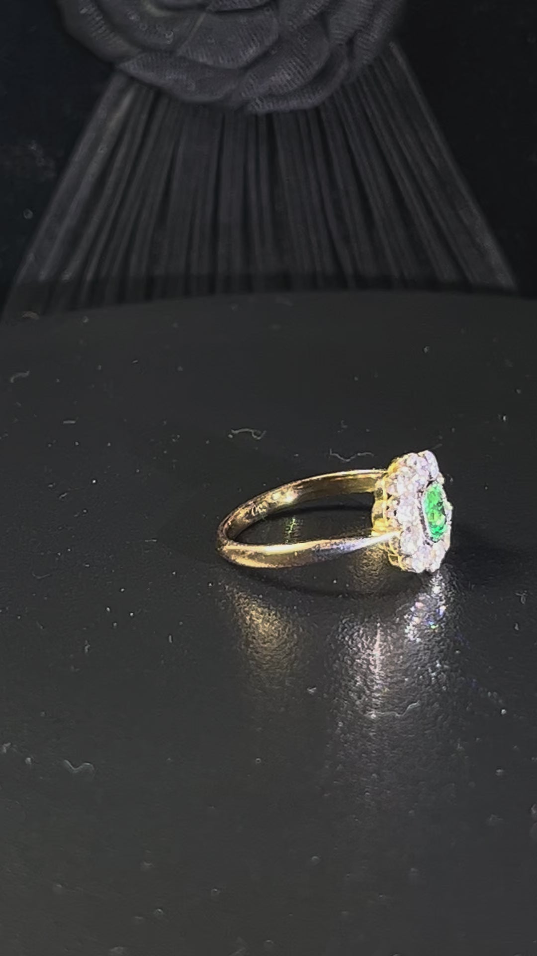 A vintage cluster ring, the centre stone a cushion shaped emerald 4x3.5mm, mid to dark green colour. Mille grain setting.