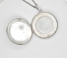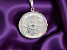 Diameter of 35mm, depth 5mm, engraved on both sides. Hinges open to reveal a glazed section for a photograph. Attached to a 22" neck chain.