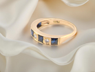 A fine half hoop eternity ring in 18 carat yellow gold, set with five square-cut inky black-blue sapphires (approx. 3.5 x 3.5 mm, ~0.25ct each).