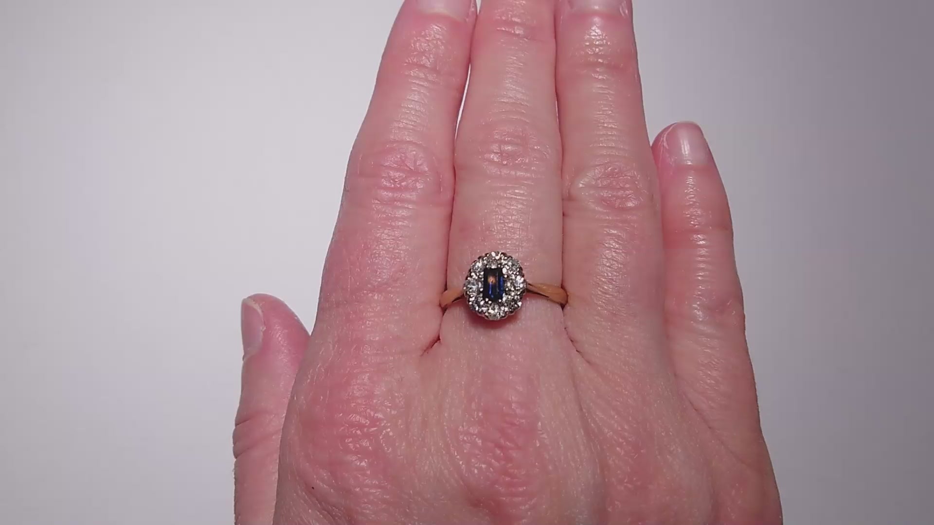 A traditional 1970s cluster ring featuring a rectangular-cut sapphire, measuring approximately 5 x 3 mm and estimated to weigh 0.25 carats, set to the centre.