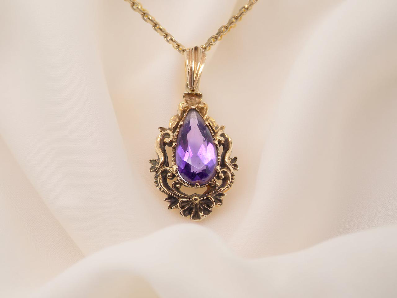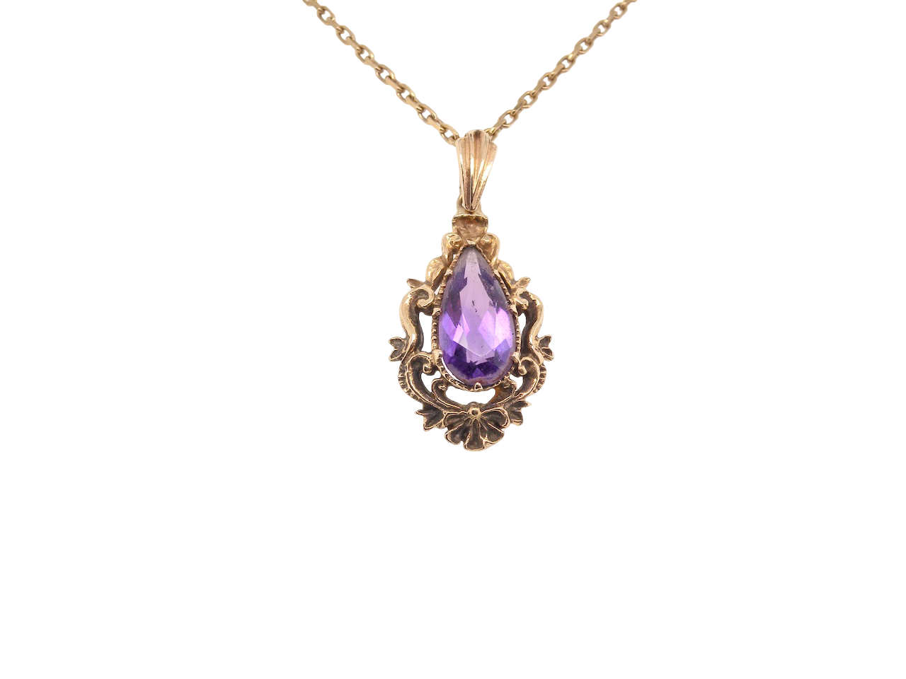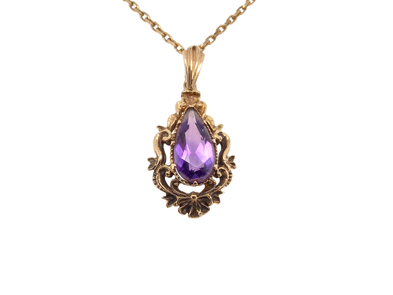 A 9 carat gold pendant that features a pear shaped amethyst centre stone. Measures 14.5x7.5mm, the setting a Victorian style faithfully reproduced in ornate style.