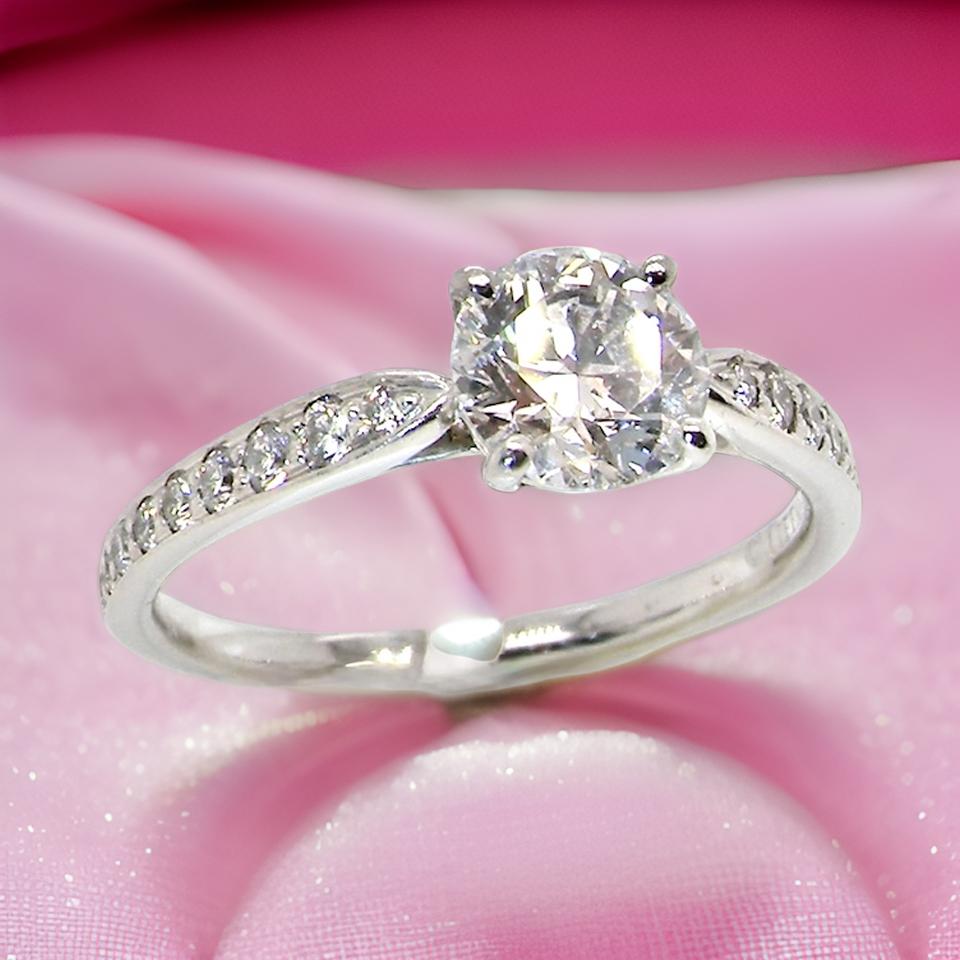 This ring matches that almost exactly with an 0.75 carat diamond, with a colour of F and a fine clarity of VVS2. This beautiful stone is set into four claws and has a run of nine small diamonds down each shoulder. Total carat weight of 0.83 carats. Hallmarked London 2015. All platinum. Head 5.9x5.9mm. Weight 2.8grams